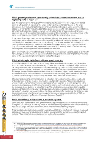 ESD is generally understood too narrowly; political and cultural barriers can lead to neglecting parts of Target 4.7 SDG 4.7 is controversial. Although all UN member states have agreed to the target, many do not seem to fully support all aspects of the target and are picking and choosing parts of the target according to their cultural or political preferences, outlooks or ideologies. Some governments appear to prefer gender inequality, opting to exclude gender equality from classrooms, whilst others, denying the climate crisis, neglect to mainstream climate change. Unsurprisingly, authoritarian countries are not always so keen to include democracy and human rights in national curricula, whilst some countries prefer curricula that prioritise nationbuilding over promoting peace. Some parts of the target have been widely sidelined. Globally, little action has been taken to mainstream human rights education across the world. Although the 1974 UNESCO Recommendation concerning Education for International Understanding, Cooperation and Peace and Education relating to Human Rights and Fundamental Freedoms has been around for a long time,149 in 2016, only 28 countries submitted their national reports to UNESCO, and only seven indicated that they had integrated human rights into pre-service teacher education. Some countries have narrowed the target, emphasising and investing in just one aspect of it. In South Korea, the government has made expansion of GCED a key priority, but according to KTU,150 this has come at the expense of implementing other parts of the target.