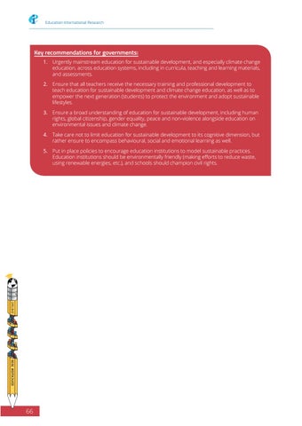 Key recommendations for governments: 1. Urgently mainstream education for sustainable development, and especially climate change education, across education systems, including in curricula, teaching and learning materials, and assessments. 2. Ensure that all teachers receive the necessary training and professional development to teach education for sustainable development and climate change education, as well as to empower the next generation (students) to protect the environment and adopt sustainable lifestyles. 3. Ensure a broad understanding of education for sustainable development, including human rights, global citizenship, gender equality, peace and non-violence alongside education on environmental issues and climate change. 4. Take care not to limit education for sustainable development to its cognitive dimension, but rather ensure to encompass behavioural, social and emotional learning as well. 5. Put in place policies to encourage education institutions to model sustainable practices. Education institutions should be environmentally friendly (making efforts to reduce waste, using renewable energies, etc.), and schools should champion civil rights.