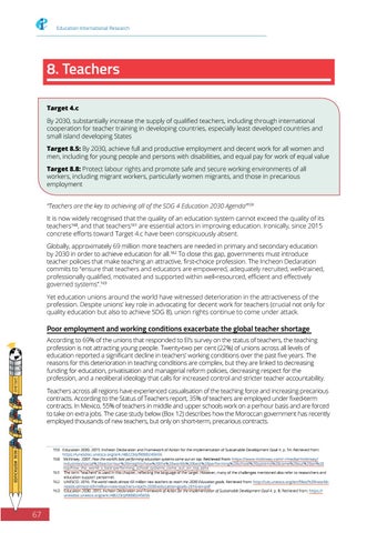8. Teachers Target 4.c By 2030, substantially increase the supply of qualified teachers, including through international cooperation for teacher training in developing countries, especially least developed countries and small island developing States Target 8.5: By 2030, achieve full and productive employment and decent work for all women and men, including for young people and persons with disabilities, and equal pay for work of equal value Target 8.8: Protect labour rights and promote safe and secure working environments of all workers, including migrant workers, particularly women migrants, and those in precarious employment “Teachers are the key to achieving all of the SDG 4 Education 2030 Agenda”159 It is now widely recognised that the quality of an education system cannot exceed the quality of its teachers160, and that teachers161 are essential actors in improving education. Ironically, since 2015 concrete efforts toward Target 4.c have been conspicuously absent. Globally, approximately 69 million more teachers are needed in primary and secondary education by 2030 in order to achieve education for all.162 To close this gap, governments must introduce teacher policies that make teaching an attractive, first-choice profession. The Incheon Declaration commits to “ensure that teachers and educators are empowered, adequately recruited, well-trained, professionally qualified, motivated and supported within well-resourced, efficient and effectively governed systems”.163 Yet education unions around the world have witnessed deterioration in the attractiveness of the profession. Despite unions’ key role in advocating for decent work for teachers (crucial not only for quality education but also to achieve SDG 8), union rights continue to come under attack.