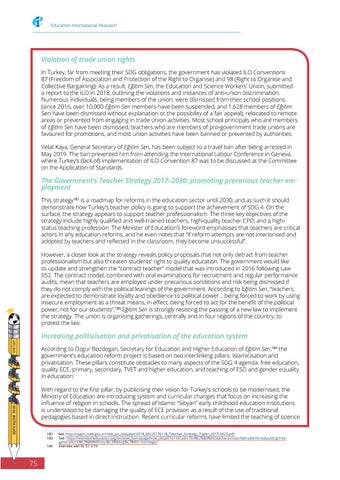 Violation of trade union rights In Turkey, far from meeting their SDG obligations, the government has violated ILO Conventions 87 (Freedom of Association and Protection of the Right to Organise) and 98 (Right to Organise and Collective Bargaining). As a result, Eğitim Sen, the Education and Science Workers’ Union, submitted a report to the ILO in 2018, outlining the violations and instances of anti-union discrimination. Numerous individuals, being members of the union, were dismissed from their school positions (since 2016, over 10,000 Eğitim Sen members have been suspended, and 1,628 members of Eğitim Sen have been dismissed without explanation or the possibility of a fair appeal), relocated to remote areas or prevented from engaging in trade union activities. Most school principals who are members of Eğitim Sen have been dismissed, teachers who are members of pro-government trade unions are favoured for promotions, and most union activities have been banned or prevented by authorities. Velat Kaya, General Secretary of Eğitim Sen, has been subject to a travel ban after being arrested in May 2019. The ban prevented him from attending the International Labour Conference in Geneva, where Turkey’s (lack of) implementation of ILO Convention 87 was to be discussed at the Committee on the Application of Standards.