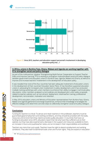 In Africa, unions in Burkina Faso, Ghana, Malawi and Uganda are working together with EI to strengthen social and policy dialogue As part of the multi-partner initiative “Strengthening Multi-Partner Cooperation to Support Teacher Policy and Improve Learning”,188 EI is working to strengthen institutionalised social and policy dialogue between government and education unions in Burkina Faso, Uganda, Malawi and Ghana, as well as to improve and increase teachers’ involvement in the development of education policy. It was revealed that none of the four countries had seen adequate involvement of education unions in the development of their countries’ Education Sector Plans. EI has therefore supported education unions in advocating for increased union involvement in policy development, and it has conducted multiple training workshops with union members to enhance their ability to engage in technical policy discussions. Union members analysed current policies and developed joint union policy proposals related to teacher policies such as recruitment, deployment, initial teacher training, professional development, remuneration, motivation and retention.
