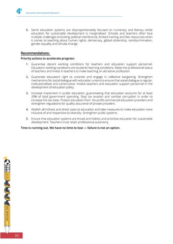 Recommendations: Priority actions to accelerate progress: 1. Guarantee decent working conditions for teachers and education support personnel. Educators’ working conditions are students’ learning conditions. Raise the professional status of teachers and invest in teachers to make teaching an attractive profession. 2. Guarantee educators’ right to unionise and engage in collective bargaining. Strengthen mechanisms for social dialogue with education unions to ensure that social dialogue is regular, institutionalised and constructive. Involve teachers and education support personnel in the development of education policy. 3. Increase investment in public education, guaranteeing that education accounts for at least 20% of total government spending. Stop tax evasion and combat corruption in order to increase the tax base. Protect education from for-profit commercial education providers and strengthen regulations for quality assurance of private providers. 4. Abolish all indirect and direct costs to education and take measures to make education more inclusive of and responsive to diversity. Strengthen public systems. 5. Ensure that education systems are broad and holistic and prioritise education for sustainable development. Teachers must retain professional autonomy. Time is running out. We have no time to lose — failure is not an option.