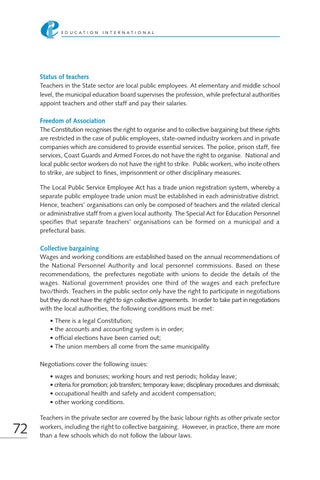 Status of teachers Teachers in the State sector are local public employees. At elementary and middle school level, the municipal education board supervises the profession, while prefectural authorities appoint teachers and other staff and pay their salaries. Freedom of Association The Constitution recognises the right to organise and to collective bargaining but these rights are restricted in the case of public employees, state-owned industry workers and in private companies which are considered to provide essential services. The police, prison staff, fire services, Coast Guards and Armed Forces do not have the right to organise. National and local public sector workers do not have the right to strike. Public workers, who incite others to strike, are subject to fines, imprisonment or other disciplinary measures. The Local Public Service Employee Act has a trade union registration system, whereby a separate public employee trade union must be established in each administrative district. Hence, teachers’ organisations can only be composed of teachers and the related clerical or administrative staff from a given local authority. The Special Act for Education Personnel specifies that separate teachers’ organisations can be formed on a municipal and a prefectural basis. Collective bargaining Wages and working conditions are established based on the annual recommendations of the National Personnel Authority and local personnel commissions. Based on these recommendations, the prefectures negotiate with unions to decide the details of the wages. National government provides one third of the wages and each prefecture two/thirds. Teachers in the public sector only have the right to participate in negotiations but they do not have the right to sign collective agreements. In order to take part in negotiations with the local authorities, the following conditions must be met: • There is a legal Constitution; • the accounts and accounting system is in order; • official elections have been carried out; • The union members all come from the same municipality. Negotiations cover the following issues: • wages and bonuses; working hours and rest periods; holiday leave; • criteria for promotion; job transfers; temporary leave; disciplinary procedures and dismissals; • occupational health and safety and accident compensation; • other working conditions.