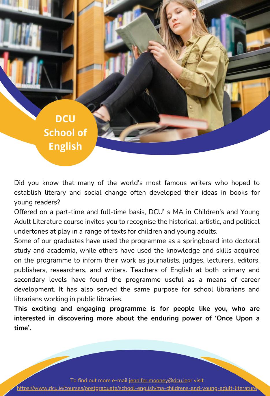 or visit www.dcu.ie/courses/postgraduate/school-english/ma-childrens-and-young-adult-literature