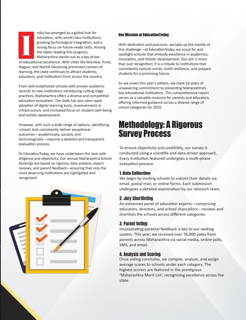 Therankingprocesswasrigorousand comprehensive.Wereceivedover 640submissionsfromacrossthe state—eachreflectingthededication andaspirationsofMaharashtra's educationalcommunity.Aspecial highlightthisyearhasbeentherobust participationfromparents,whose insightsandpreferenceswere instrumentalinshapingthefinallist. Theiractiveinvolvementensureda