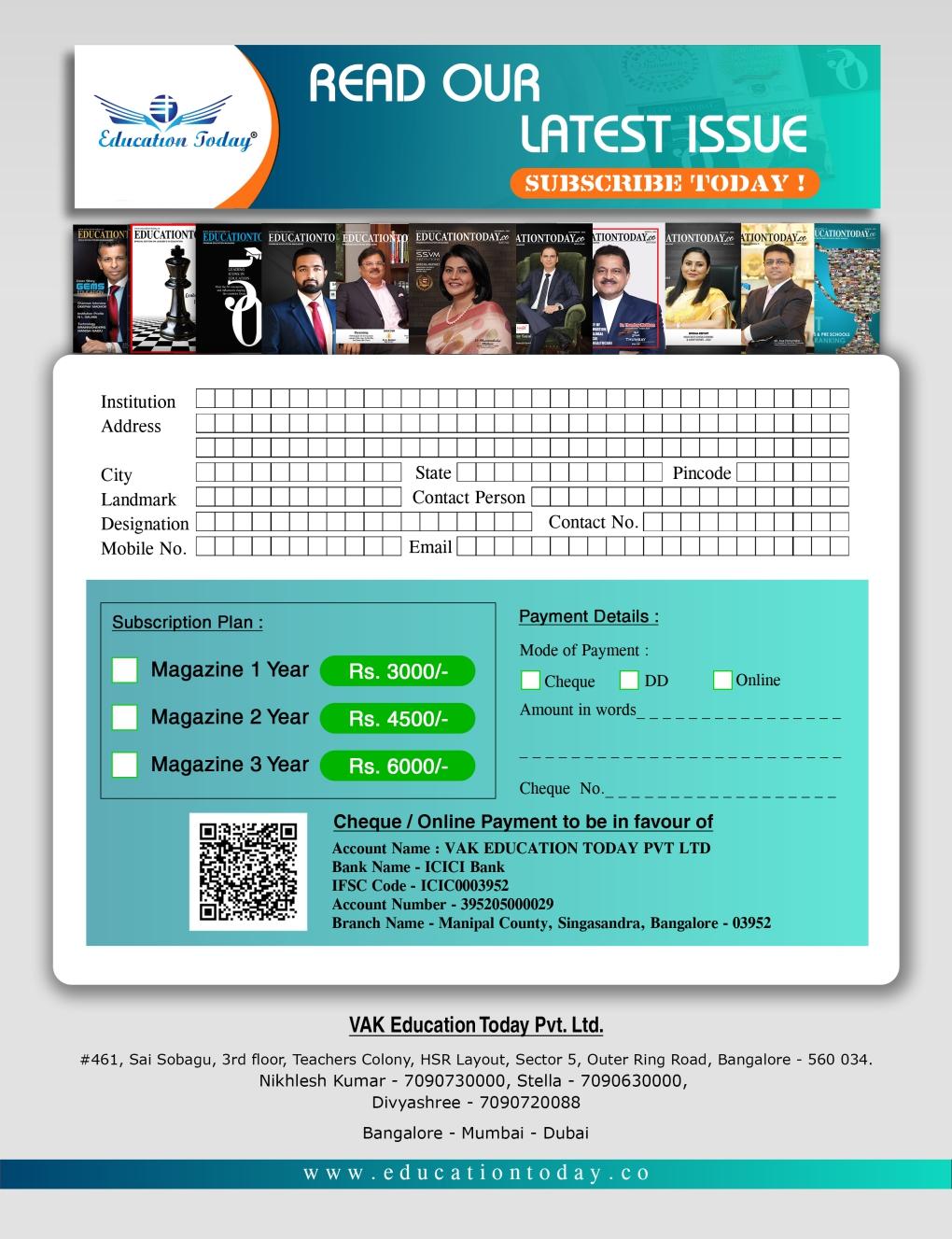 Annual Subscription to our Magazine (12 issues) - Rs. 3000 admin@educationtoday.co