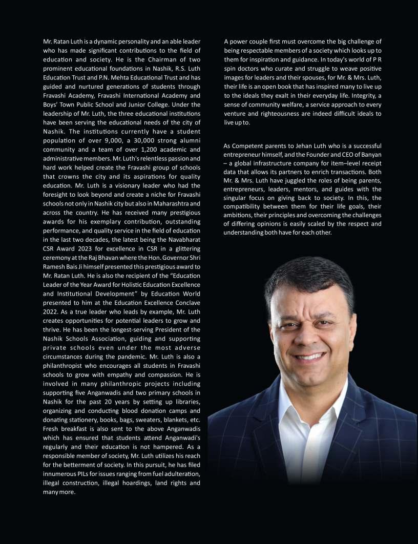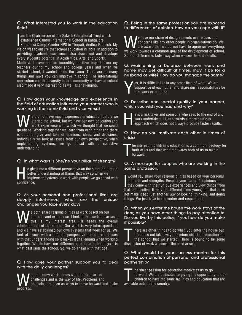 The special issue of Educa on Today focuses on the contribu on/achievement of Power Couples who create a posi ve wave of change in the Indian educa onal sector through their achievement and milestones. It is their extraordinary courage, dedica on, pa ence, and devo on that weave the garland of countless smiling faces of students; the original 'Divas' in the educa on sector. It says that dream is the stepping stone to success; but dream is not that which you see while asleep, it is something that does not let you sleep. With their reless, dynamic work to redefine educa on in India, with a clear philosophy they have cra ed a story of success as power couples in the educa on sector in India; as