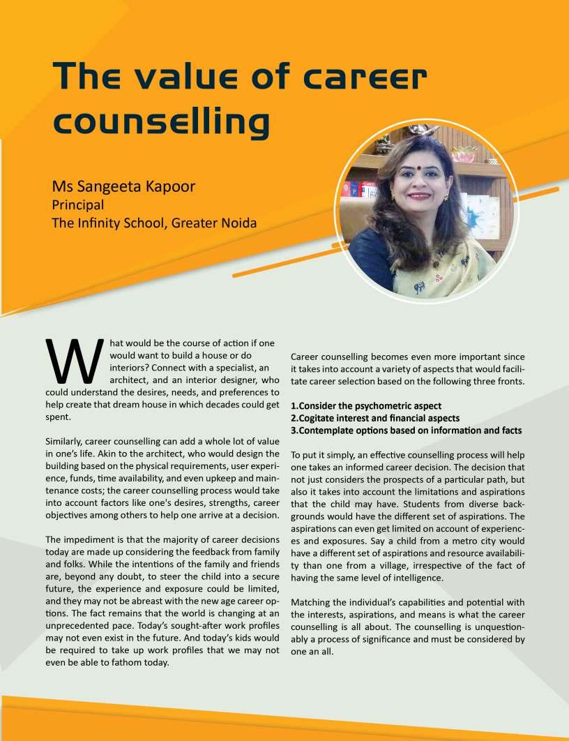Our special report on Na onal Curriculum Framework features in this issue highlights its objec ves to bestow students a holis c approach of the world keeping the sense of pride of the bright legacy of Indian culture. This issue also features valuable ar cles by educators regarding the transi on of educa on, the changes that Indian educa on need. The ar cles featuring career counselling, ways to imbibe emo onal intelligence in students, technology in educa on, changing landscape and changes in the educa on system are showing the way to adapt a revolu onary approach in the Indian educa on sector. You will also have a pleasant me reading hobby, and cra sec on- it is the Wonder Strokes of the magazine!