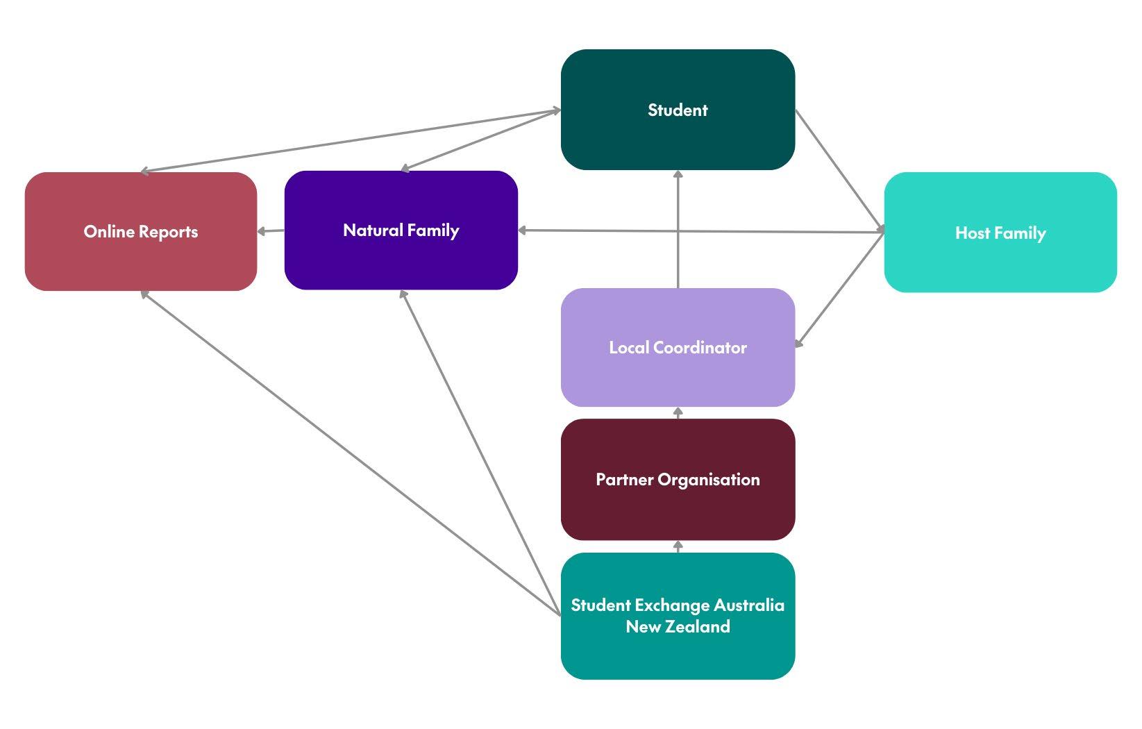 The diagram shows how the total network operates to support students, natural families, and host families. Good communication via the support network is imperative for the success of an exchange experience.