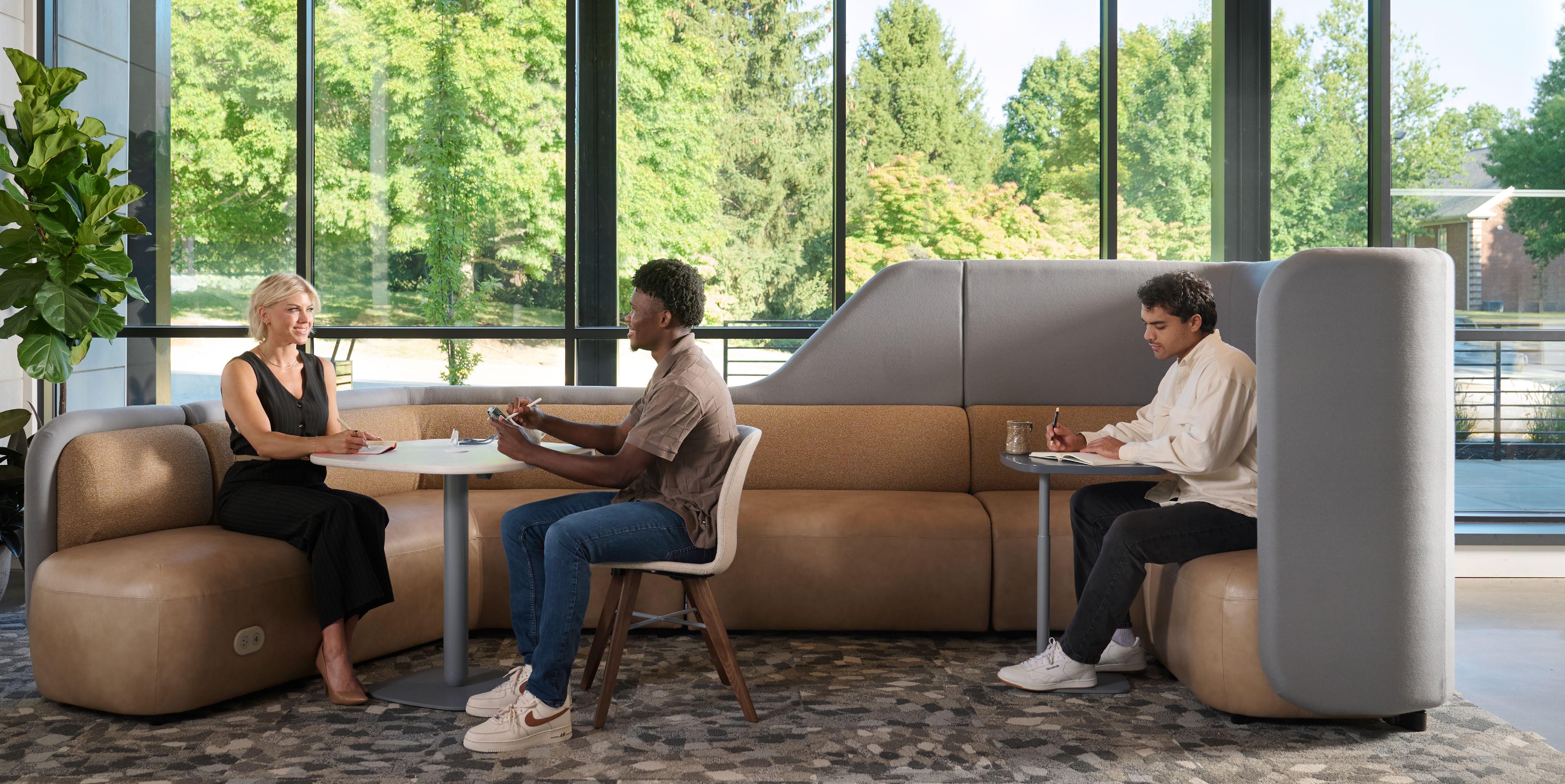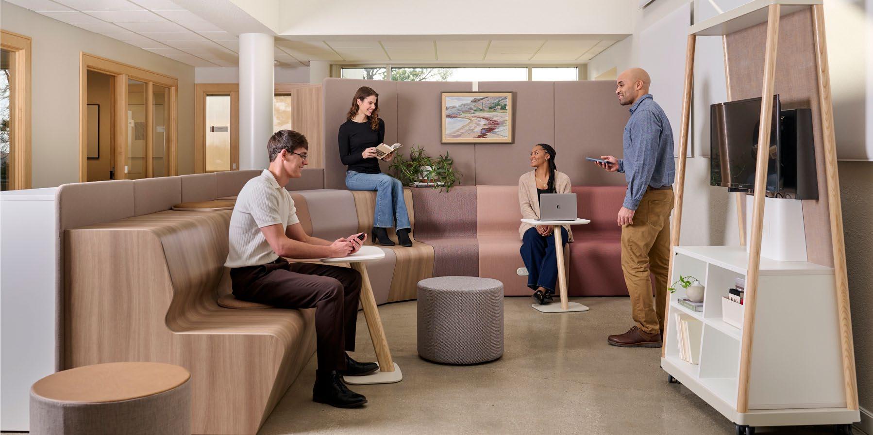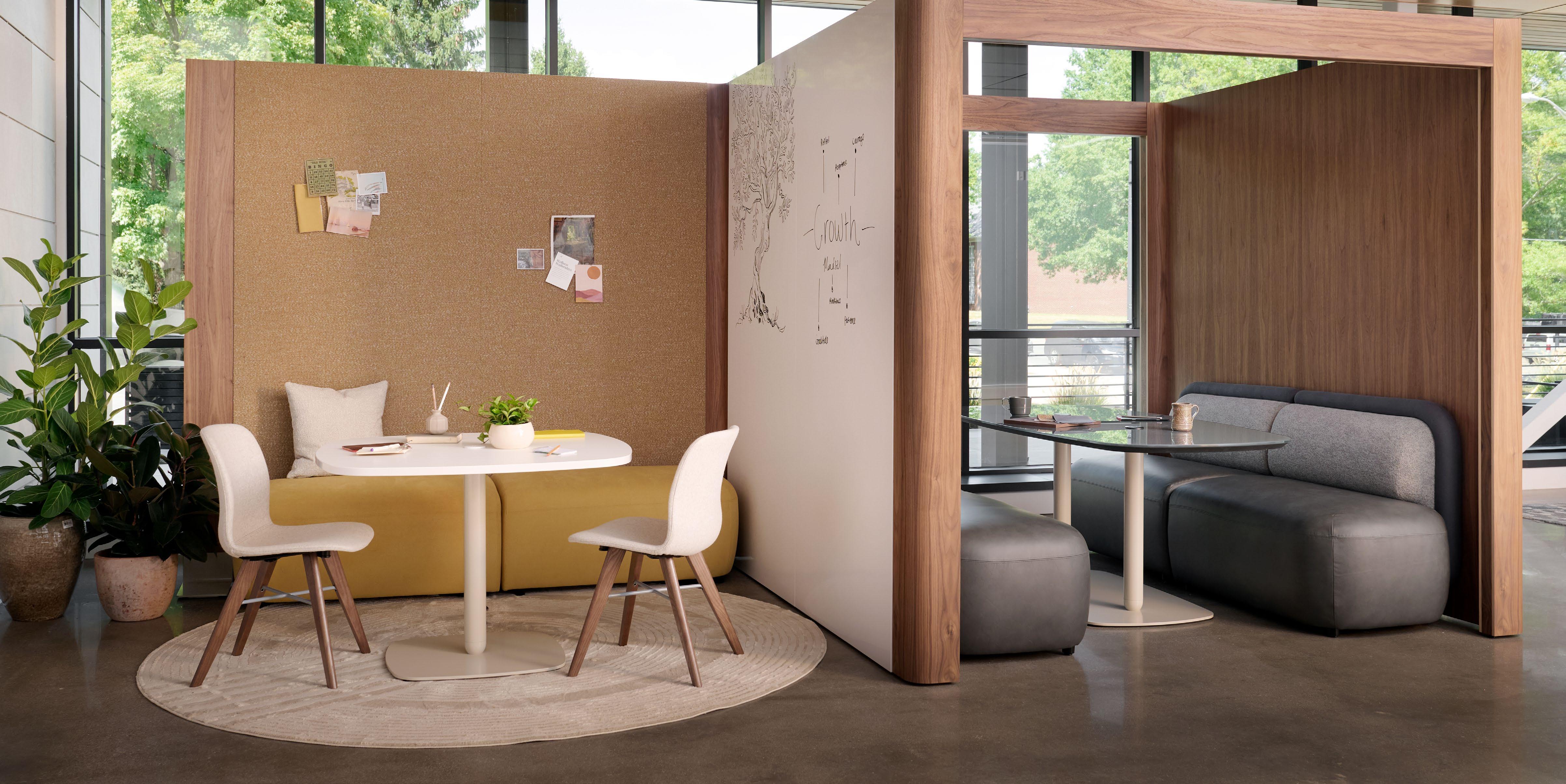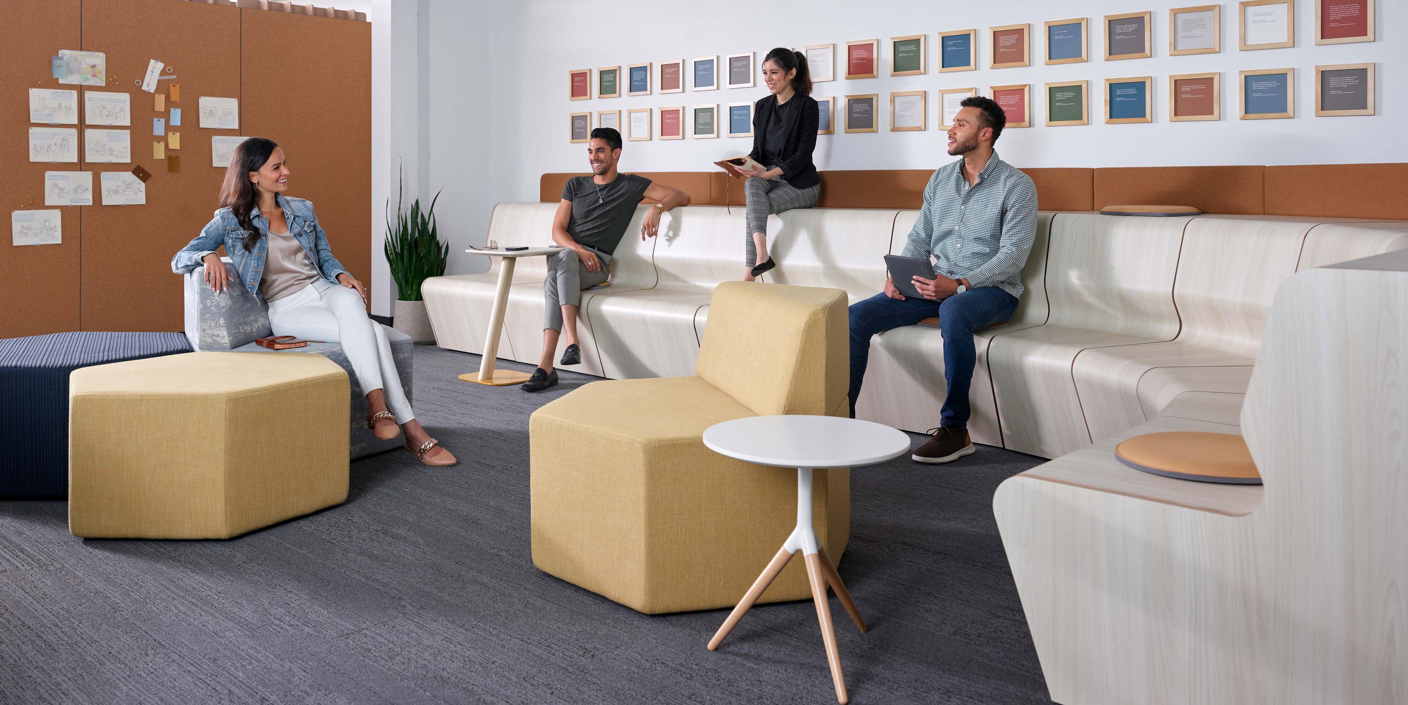 Obeya flexible framework, Hinchada modular lounge, Boost ottoman, Kosa occasional Café + common areas Learning + classroom Library + study spaces