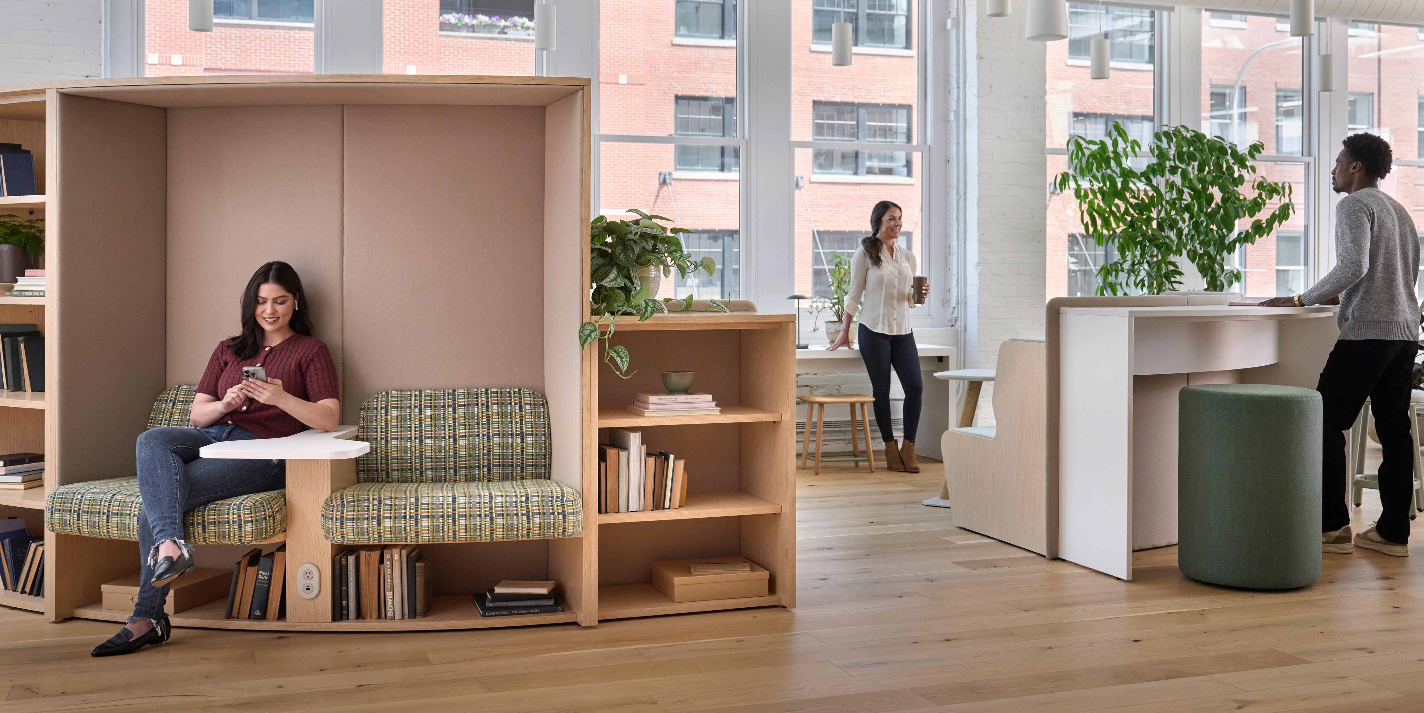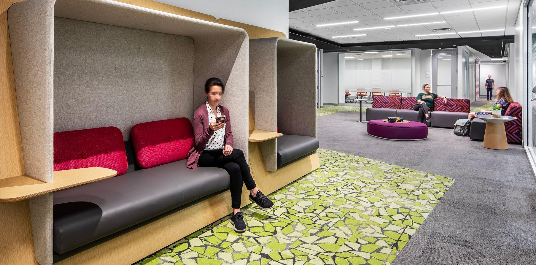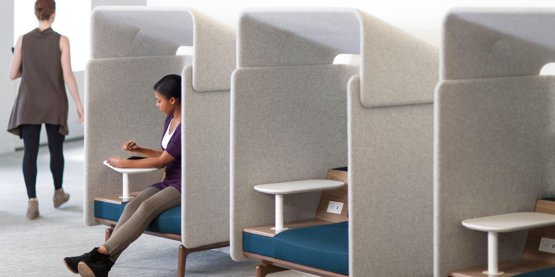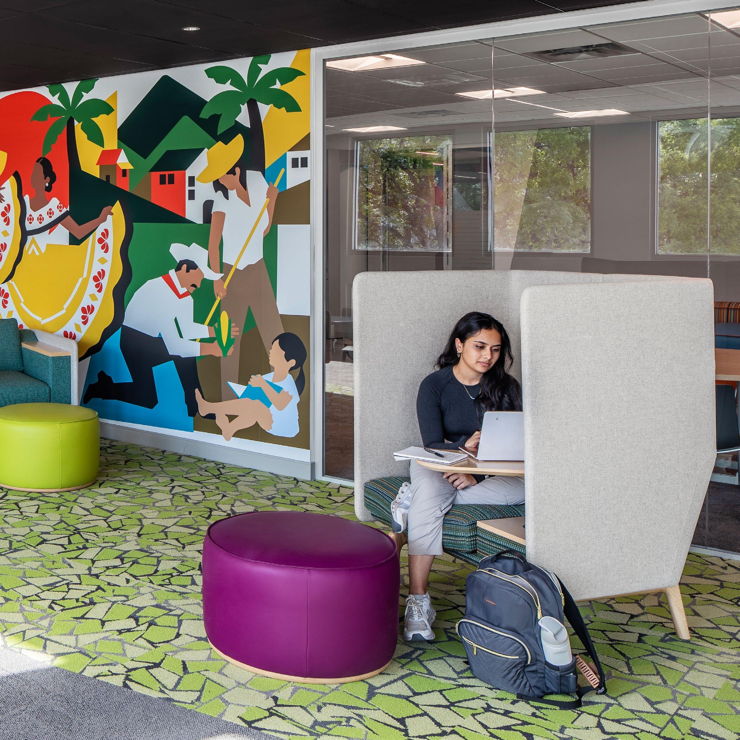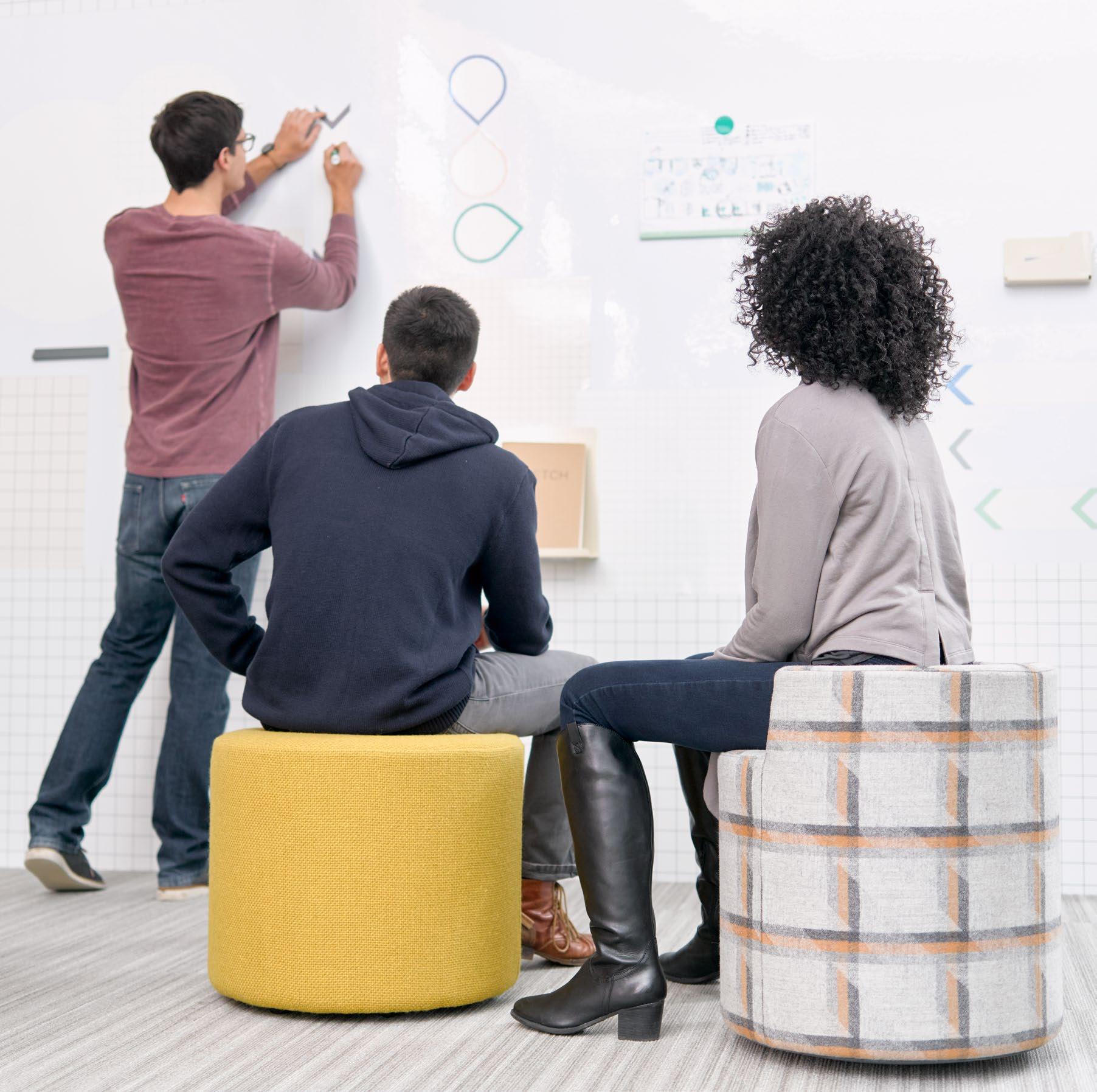 Obeya flexible framework, Hinchada modular lounge, Boost ottoman, Kosa occasional Café + common areas Learning + classroom Library + study spaces