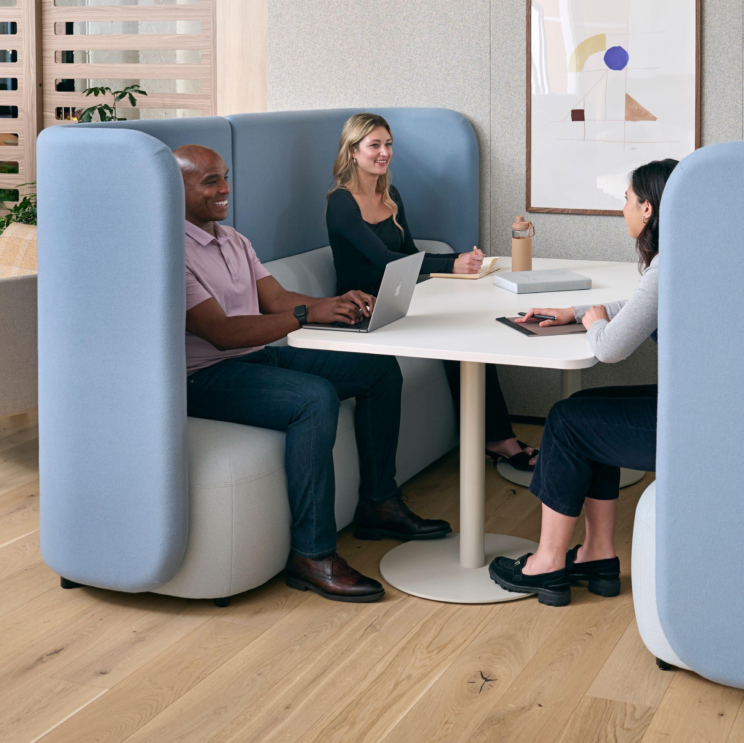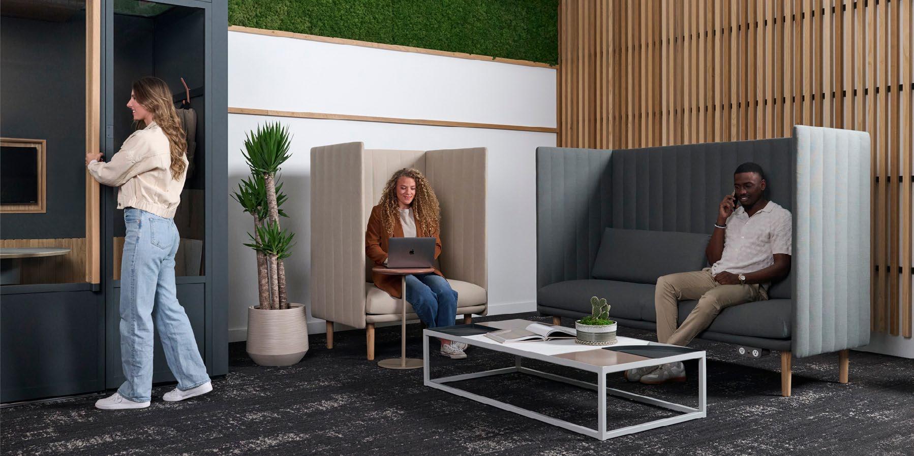 Bottom: Gathr modular lounge, Boost ottoman, Heya pull-up table, Kaleid screen/partition