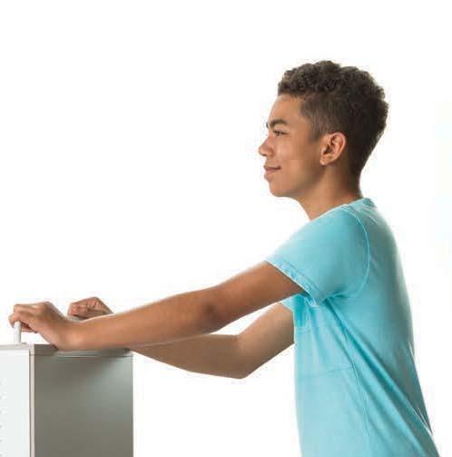 Standing tables and group standing tables with foot supports – very important for dynamic standing – are important basic furniture for indoor spaces. They encourage spontaneous posture changes (sitting/standing/standsitting). Accordingly, they should also be used for standing and not for continuous high sitting. High tables are particularly useful during group work. Ideal non-adjustable standing tables accommodate an average body height for the relevant age group, which means around 35 inches for 3rd to 7th graders and around 42 inches for 8th to 12th graders. Adapting the