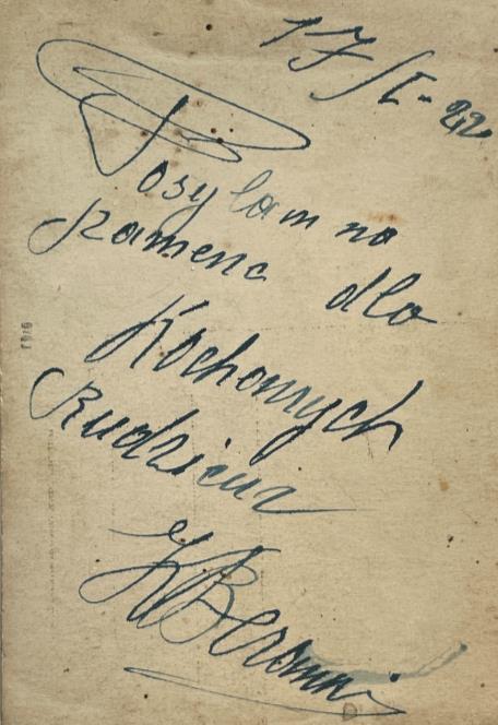 Kitoje nuotraukos pusėje surašyti mano giminaičių vardai ir pavardės (Velikij). Taip pat parašyti šilti žodžiai apie laiką, praleistą su šeima, net gyvenat Smolenske sunkiomis sąlygomis: „Atminimui tų laimingų dienų, kai buvome kartu su tėvais ir gyvenome po jų stogu, nežinodami rūpesčių, kupini džiaugsmo ir laimės. Tegul ši nuotrauka šiandien primena tą tolimą šalį. I.V.Velikij.“