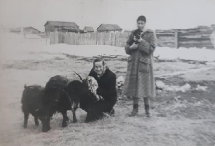 Šalia proprosenelės nuotraukoje stovi draugė, su kuria ji susipažino jau būdama tremtyje – jos vardas, deja, liko nežinomas. Nuotraukoje yra užfiksuota kasdienė akimirka iš tremtinių gyvenimo Sibire, ji greičiausiai buvo padaryta norint įamžinti atsiminimą apie jų gyvenimą ir buitį. Nuotraukoje prie moterų yra matomi keli gyvūnai, ko gero, ožkos su ožiukais. Taip pat fone matoma tipinė Sibire gyvenusių lietuvių aplinka: mediniai nameliai (barakai), apsupti tvora, ir sniego lopai, atspindintys atšiaurias gamtines sąlygas. Fotografija buvo padaryta maždaug 1949 – 1958 metų laikotarpiu. 1958 metų kovo 3 dieną Juzė Kalvelienė iš Sibiro grįžo į Lietuvą.