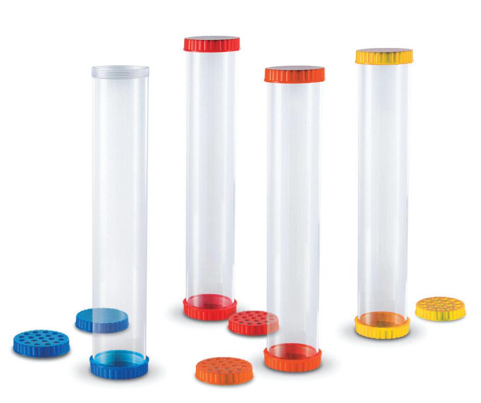Freestanding, dual-opening, multifunction plastic tubes include eight solid and four vented lids that fit securely and twist easily on and off, enabling children to go ‘hands-free’ while investigating all things bright, noisy, aromatic and more! Tubes measure 300mm in length. Supplied empty. Age 2+.
