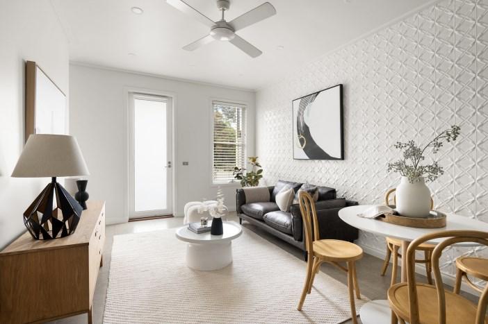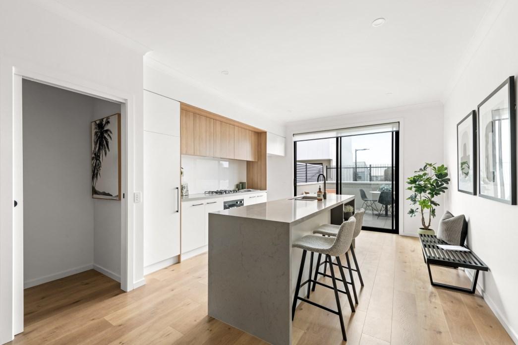 Situated in the One Lakeview estate on Jawbone Flora and Fauna Reserve, this three level, three bedroom townhouse is designed by ClarkeHopkinsClarke and celebrates community, sustainability and flexibility. The second level is devoted to living and dining with an expansive terrace for entertaining overlooking seaside wetlands plus a chefs kitchen with Fisher & Paykel gas cooking, dishwasher and elongated stone waterfall bench. The three large bedrooms all boast double BIRs and Panasonic air conditioning, the main with ensuite and extra storage. Further livability is ensured with a separate bathroom with shower on the ground floor, and a family bathroom with luxuriously deep bath on the third.