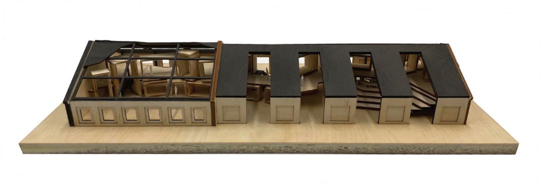 InspiredbytheshippingcratesthatwouldhavefilledtheO+MShedsintheirheyday, boxesfillthespacecreatingadivisionbetweentheprotectedandunprotectedareas. However,theabilitytoopenthewindowsalongtheunprotectedsidescreatesan interactionwiththetwoareasandallowslightandairflow.
