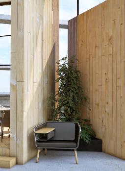 Eachboxdividingtheprotectedandunprotectedspacesiscladwithwoodormetal.Split byaglasswall,theunprotectedmaterialswillageatfasterratethantheirprotected counterparts.Eachsurfacewilldevelopaninterestingpatinaandallowtheoccupantstosee theageingofmaterialsthroughtheseasons.