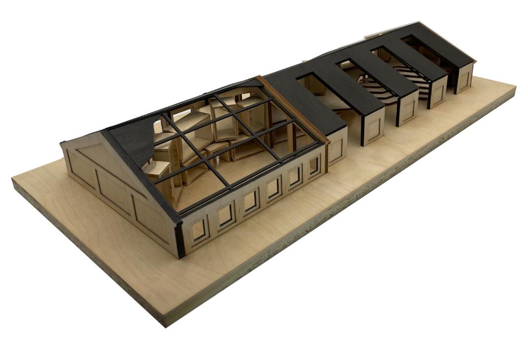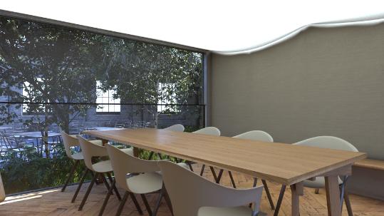 InspiredbytheshippingcratesthatwouldhavefilledtheO+MShedsintheirheyday, boxesfillthespacecreatingadivisionbetweentheprotectedandunprotectedareas. However,theabilitytoopenthewindowsalongtheunprotectedsidescreatesan interactionwiththetwoareasandallowslightandairflow.