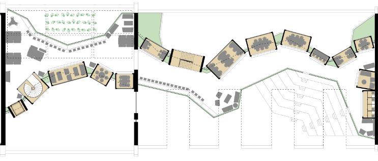 Thevarioussizedboxescreatespaciousandintimateareasforusersandarepurposed fordifferentuses:housingworkenvironments,meetingspaces,toilets,staircasesandan elevator.
