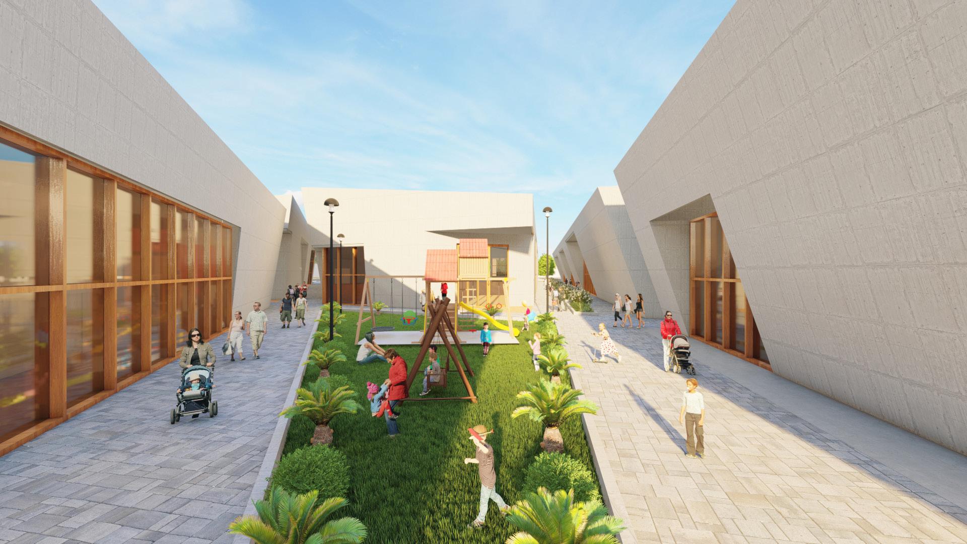 Los volúmenes están compuesto de una forma de un cuadrado lleno la cual se va cortando por corredores lineales. los mismos comunican a los diferentes volumenes. Asi mismo estos recorridos te llevan a los distintos patios que estan distribuidos dentro del proyecto.