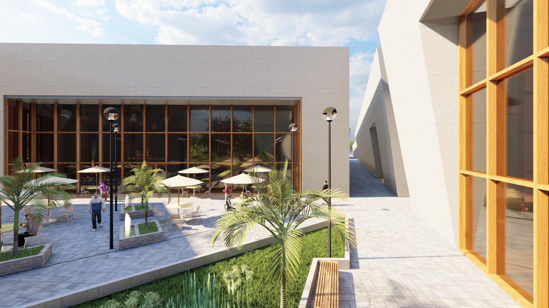 Patio del ingreso principal, con mobiliario urbano de descanso.