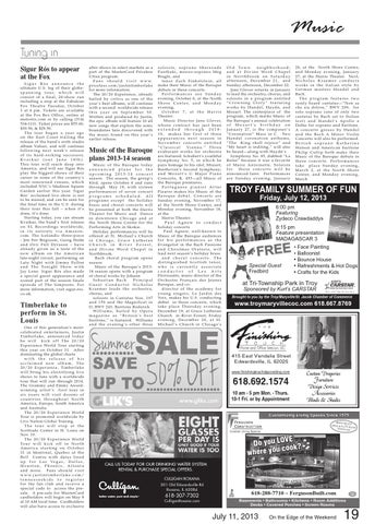 Timberlake to perform in St. Louis One of this generation’s mostcelebrated entertainers, Justin Ti m b e r l a k e , a n n o u n c e d t o d a y he will kick off The 20/20 Experience World Tour starting this year on October 31. After dominating the global charts with the release of his acclaimed new album, The 20/ 2 0 E x p e r i e n c e , Ti m b e r l a k e will bring his electrifying live shows to fans with a worldwide tour that will run through 2014. The Grammy and Emmy Awardwin n i n g a r t i s t ’ s f i r s t t o u r i n six years will visit dozens of countries throughout North America, Europe, South America and Australia. The 20/20 Experience World Tour is promoted worldwide by Live Nation Global Touring. The tour will stop at the Scottrade Center in St. Louis on Nov. 19. The 20/20 Experience World To u r w i l l k i c k o f f i n N o r t h America starting on October 31 in Montreal, Quebec at the B e l l C e n t re w i t h d a t e s l i n e d u p f o r L a s Ve g a s , D a l l a s , Houston, Phoenix, Atlanta a n d m o re . F a n s s h o u l d v i s i t w w w. j u s t i n t i m b e r l a k e . c o m / tennesseekids to register for the fan club and receive a special code to access the presale. A pre-sale for MasterCard cardholders will begin on May 8 at 10 AM local time. Cardholders will also have access to exclusive