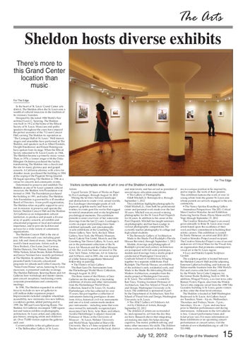 Sheldon hosts diverse exhibits There's more to this Grand Center location than music For The Edge In the heart of St. Louis' Grand Center arts district, The Sheldon offers the St. Louis area a wealth of cultural resources in the tradition of its visionary founders. Designed by the noted 1904 World's Fair architect Louis C. Spiering, The Sheldon was built in 1912 as the home of the Ethical Society of St. Louis. Musicians and public speakers throughout the years have enjoyed the perfect acoustics of the 712-seat Concert Hall, earning The Sheldon its reputation as "The Carnegie Hall of St. Louis." Well-known singers and ensembles have performed at The Sheldon, and speakers such as Albert Einstein, Dwight Eisenhower and Ernest Hemingway have spoken from its stage. When the Ethical Society relocated to St. Louis County in 1964, The Sheldon became a primarily music venue. Then, in 1974, a former singer with the Duke Ellington Orchestra purchased the facility, transforming The Sheldon into a church and the site for many glorious jazz and gospel concerts. A California attorney with a love for chamber music purchased the building in 1984 at the urging of the Paganini String Quartet. He began operating The Sheldon in 1986 as a venue for concerts and community events. Determined to preserve and establish The Sheldon as one of St. Louis' greatest cultural resources, the Sheldon Arts Foundation was formed in 1988. The Foundation purchased the building in 1991, and today The Sheldon Arts Foundation is governed by a 45-member Board of Directors. A non-profit organization, The Sheldon relies on public support to carry out its mission: to preserve and operate the historic Sheldon Concert Hall and the Sheldon Art Galleries as an independent cultural institution, to produce and present a diverse array of quality concerts, art exhibits and educational programs of local and national importance, and to provide facilities and services for a wide variety of community organizations. The Sheldon Concert Hall is the site of over 300 events each year, including great jazz, folk and classical music, featuring the world's finest musicians. Artists such as Dave Brubeck, Cleo Laine, José Carreras, Herbie Hancock, Doc Watson, Joan Baez, Willie Nelson, Julian Bream, Itzhak Perlman and Jessye Norman have recently performed at The Sheldon. In addition, The Sheldon presents Family Concerts, educational programs for schools and Coffee Concerts. The "Notes From Home" series, featuring St. Louis musicians, is presented weekday evenings. The Sheldon Ballroom, Spiering Room and Art Galleries host workshops and master classes, post-concert receptions, fundraising events, corporate presentations and community meetings. In 1998, The Sheldon expanded its artistic focus to include six new art galleries in a $5 million dollar expansion project. Improvements included complete wheelchair accessibility, new restrooms, two new lobbies, a sculpture garden, added parking and in 1999, the 500-seat Louis Spiering Room. The Sheldon Art Galleries encompass 7,000 square feet and feature exhibits on photography, architecture, St. Louis artists and collection, jazz history, emerging artists and children's art. Over 75,000 visitors explore the galleries each year. Current exhibits in the art galleries are: • The Bellweather Gallery of St. Louis