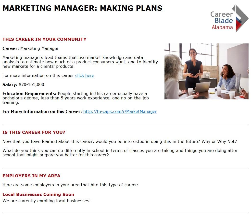Career Highlight: This lesson plan highlights some of the concepts and skills a Marketing Manager uses to get buyers to want and purchase their products and services. See the Employers in My Area section to contact businesses and organizations in your area about classroom demonstrations, on-site visits, or other additional career exposure opportunities.