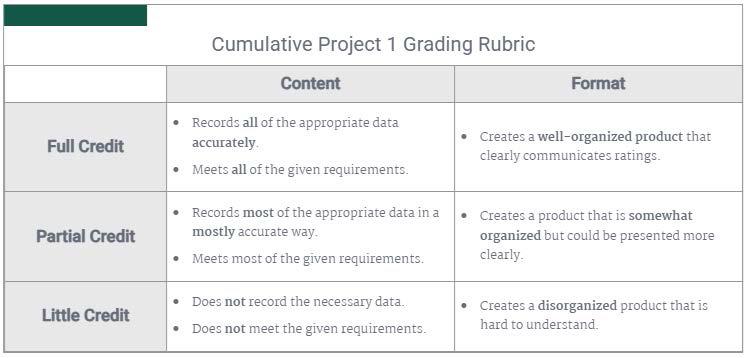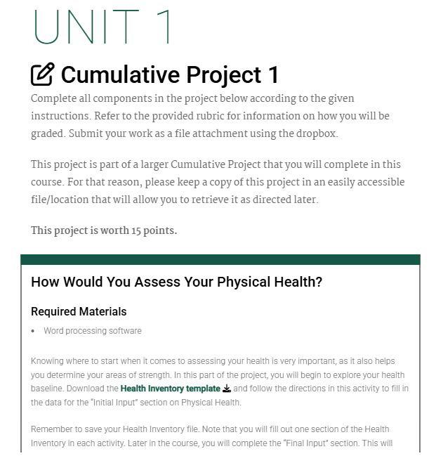 Each unit has one (1) to five (5) Activities which require a student to produce a product and submit it to their teacher for grading. Some activities are Labs or Cumulative Projects. Cumulative Projects are broken down into parts that students complete through multiple units in the course. Rubrics are provided for students Suggested answers and a rubric are included in Teacher Resources.
