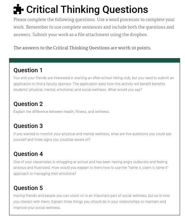 There are five (5) Critical Thinking Questions in every unit. Suggested answers and a rubric are included in Teacher Resources.