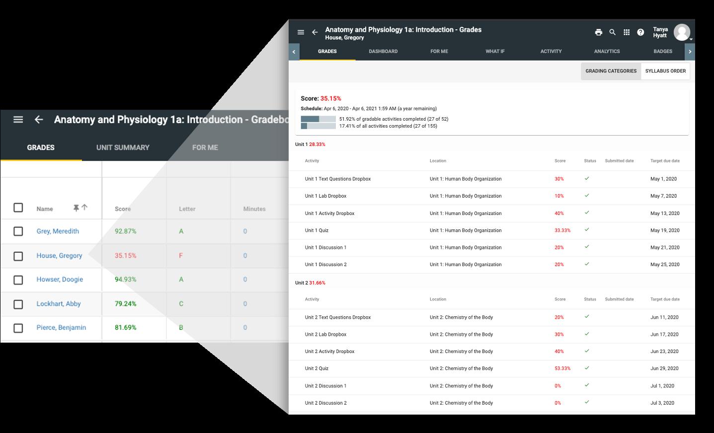 A comprehensive gradebook gives teachers access to grades and valuable data insights to help target and personalize instruction. Simplistic dashboard views enable teachers to see how individual students are doing in the course with performance data, cumulative score, time spent in the course, performance, pace,