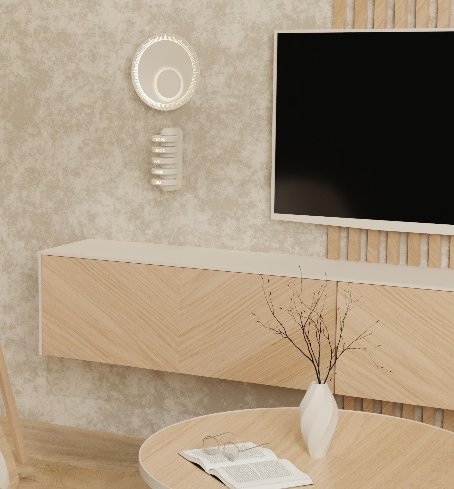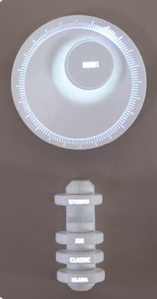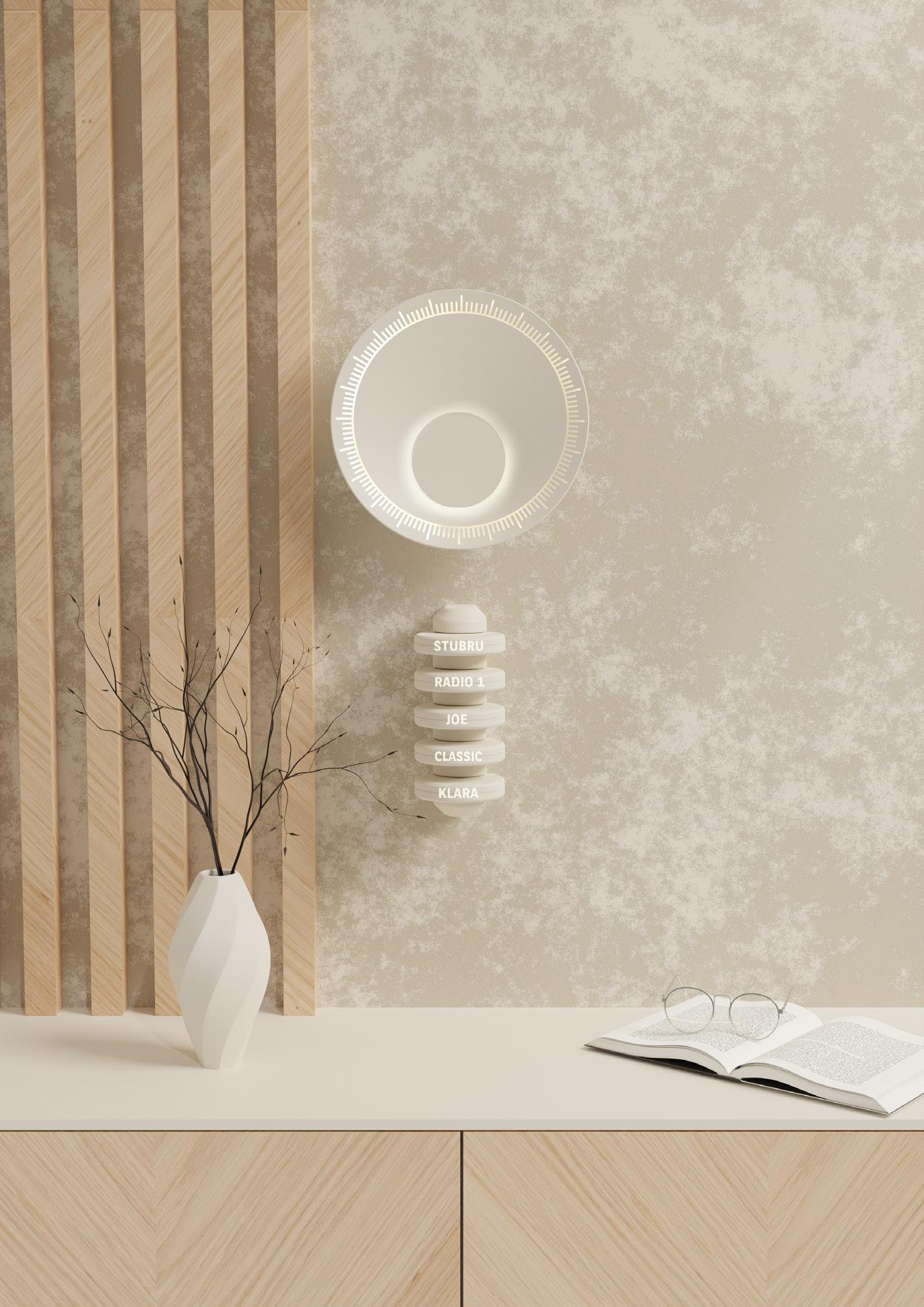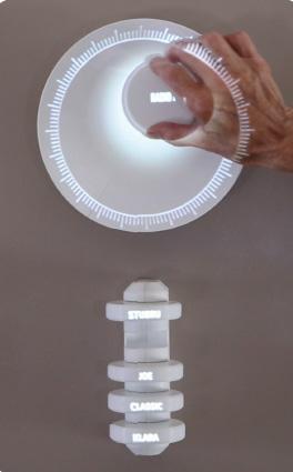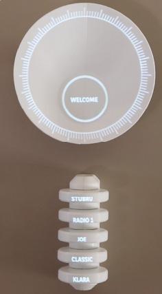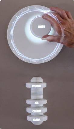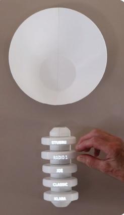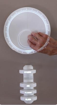 04: De schelp draait tot de juist frequentie om de zender af te spelen. 05: Draai aan de schijf van de zender om het volume bij te stellen. 06: visualisatie van het volume d.m.v de grootte van de gloed rond de schijf.