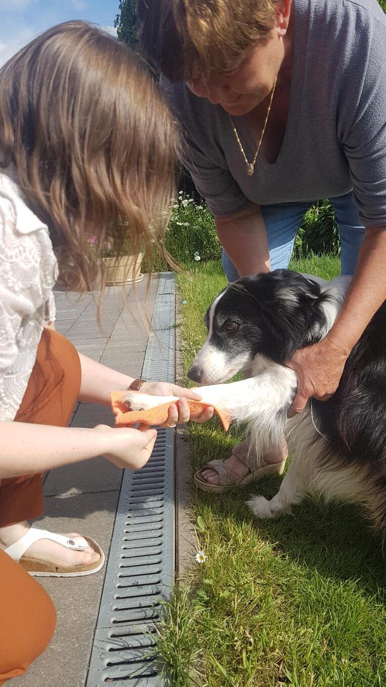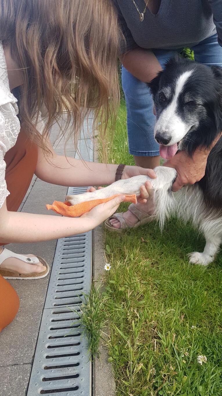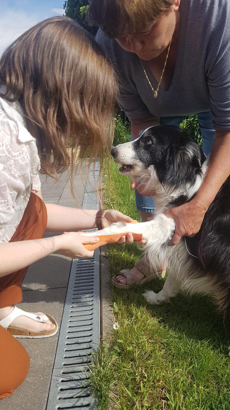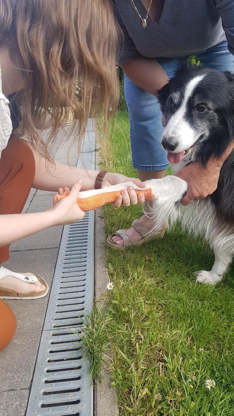 De hond Flo krijgt voor het eerst een thermoplastische spalk. Het gebruikte materiaal is Orficast van Orfit Industries.