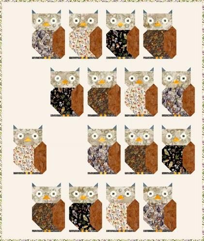 Fabrics, Black version: Lt Cream version: 1 Kit 10 Kits 20 Kits Color 1: Teal Digital Watercolor Tonal Y4083-104 Olive Digital Fronds Y4077-24 ⅝ yd 1 bolt 1 bolt Color 2: Dk Pewter Digital Agate Y4084-120 Lt Brown Digital Moss Stones Y4080-14 ⅝ yd 1 bolt 1 bolt Color 3: Dk Caramel Digital Stones Y4082-66 Dk Caramel Digital Stones Y4082-66 ⅝ yd 1 bolt 1 bolt Color 4: Dk Rust Digital Watercolor Tonal Y4083-72 Dk Rust Digital Watercolor Tonal Y4083-72 ⅝ yd 1 bolt 1 bolt Color 5: Butter Digital Mushrooms Y4079-59 Black Digital Forest Floor Y4078-3 ⅝ yd 1 bolt 1 bolt Color 6: Khaki Digital Sandstone Y4081-12 Khaki Digital Sandstone Y4081-12 ⅜ yd 1 bolt 1 bolt Background: Black Dappled Y2949-3 Lt Cream Impressions Moiré Y1323-2 3 yds 2 bolts 4 bolts Binding: Multi Digital Packed Owls Y4074-55 Lt Cream Digital Fronds Y4077-2 ⅝ yd 1 bolt 1 bolt Backing: Black Digital Mushrooms & Owls Y4075-3 Butter Digital Mushrooms Y4079-59 3 ⅝ yds 3 bolts 5 bolts