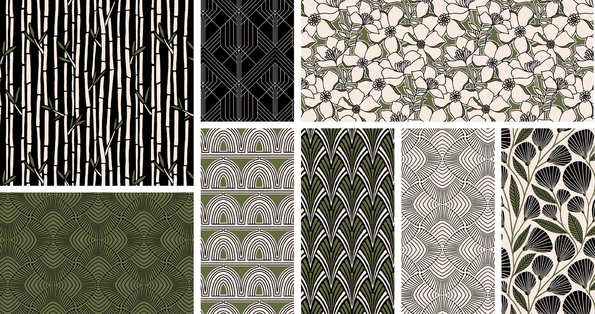 MARSH HAVENS evokes the quiet waters, gentle reeds, and calming greens of marshlands and estuaries. Immerse yourself in a world where the water meets the land with the geometrics, florals, and natural elements.