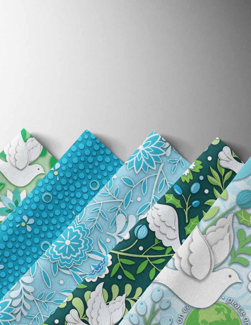 LOOKBOOK • 15BENARTEX.COM • 212-840-3250 Peace on Earth Winter Panel Sapphire 13661-53 (24” x 44”) Damask Ocean 13663-52 Damask Jade 13663-49 Damask Mint 13663-04 PEW10PK • STPEWPK • FQPEWPK (15 PC) June/July 2023 Delivery • 16 SKUs • 100% Cotton • Full Collection (15 yds): POEWTR15 • (10 yds): POEWTR10