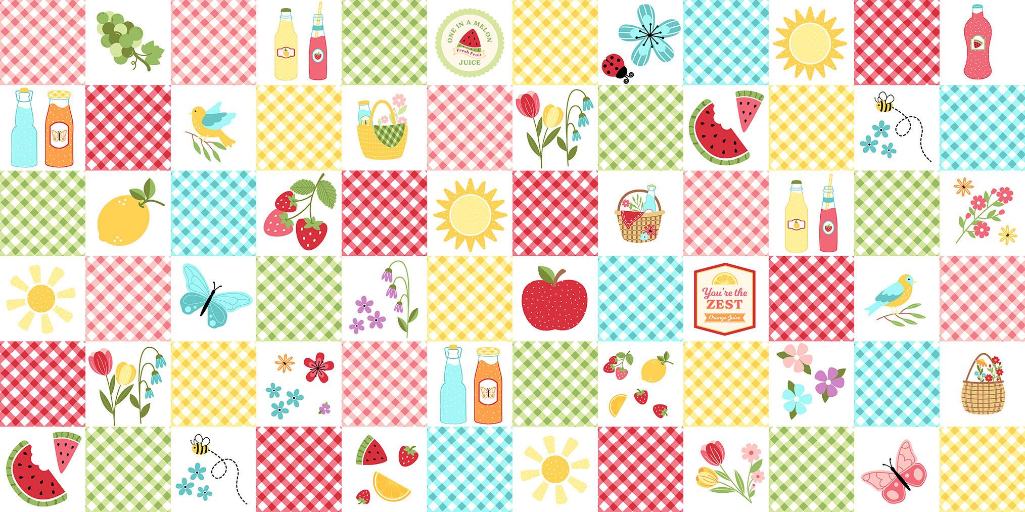 Celebrate the sweet side of summer with Sippin’ on Sunshine, the cheerful new collection from Kimberbell®. Bursting with ripe fruits, fresh florals, and sunny charm, this collection captures the simple joys of picnic season. Whimsical prints pair with a coordinating canvas, perfect for colorful quilts, breezy aprons, and all your favorite warm-weather projects. You can almost hear the laughter, taste the chilled juice, and feel the sunshine lighting up those long, golden days.
