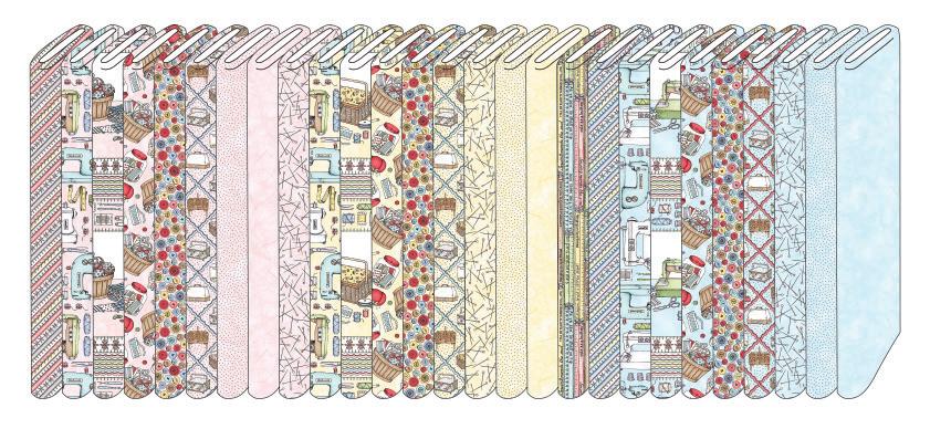 The decorative stitched border stripe, sewing themed blenders, and conversational prints in this playful collection will guarantee that your projects measure up to your crafting dreams.