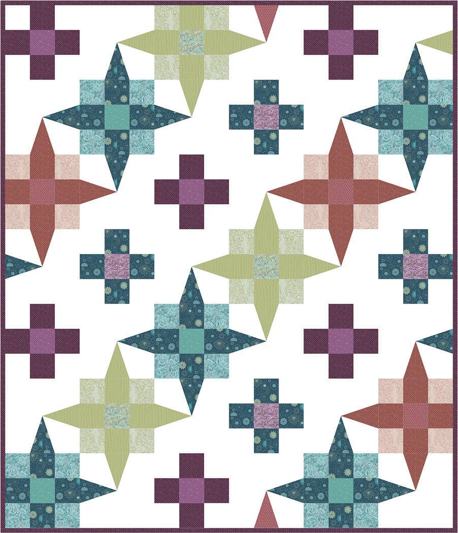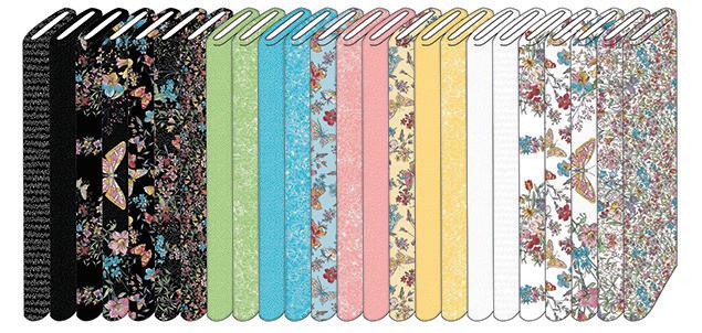 Contrasting backgrounds make the perfect canvas for interlaced florals, subtle pin dots, and detailed line work. The dramatic panel print features a set of quilt labels and butterfly vignettes that complement a free hand-embroidery pattern, available when the collection ships.