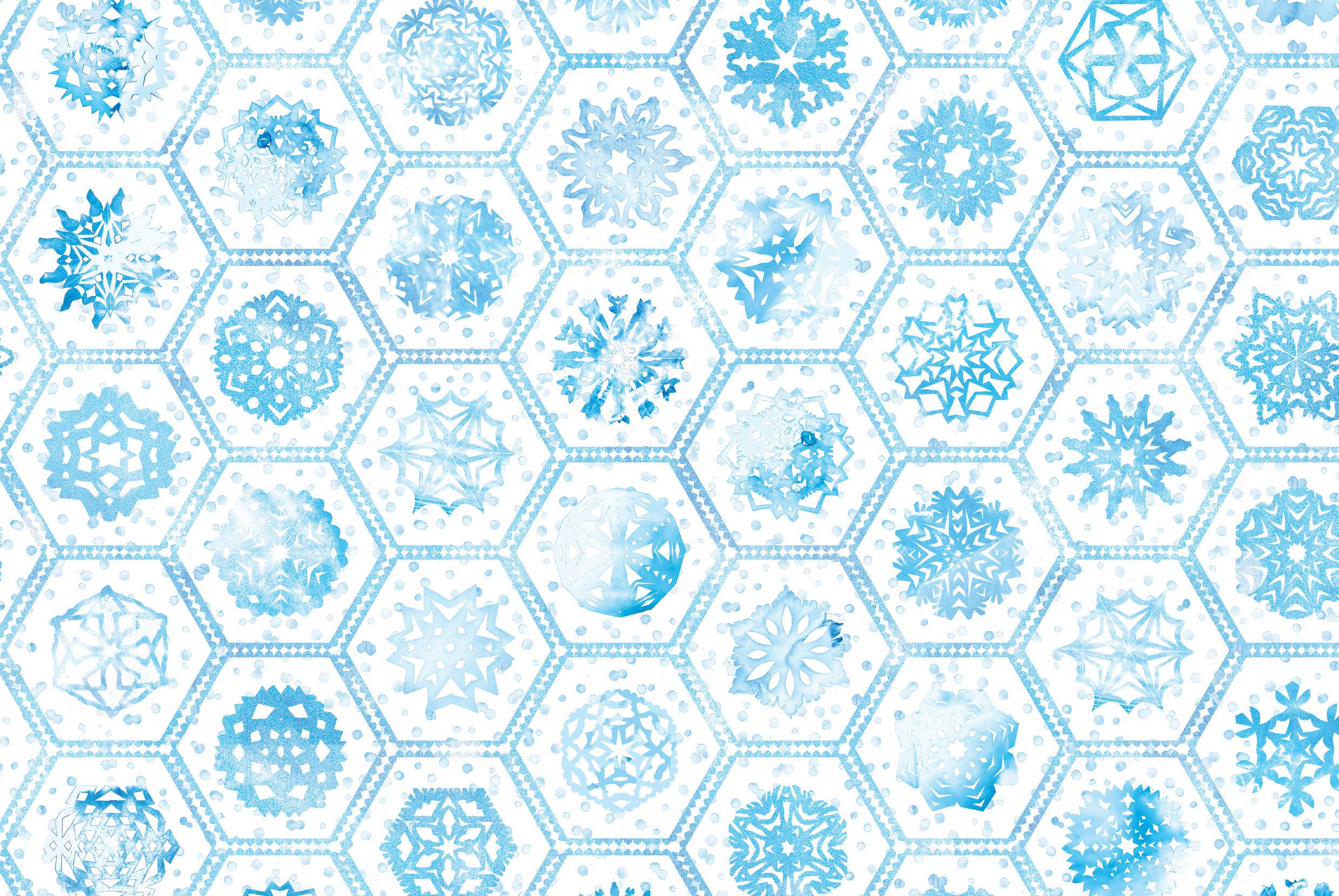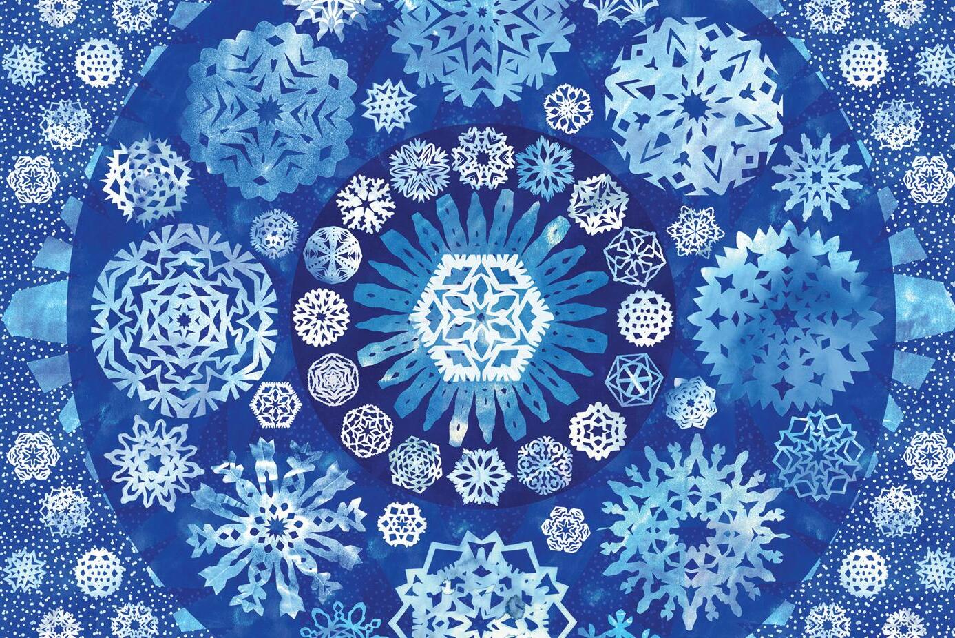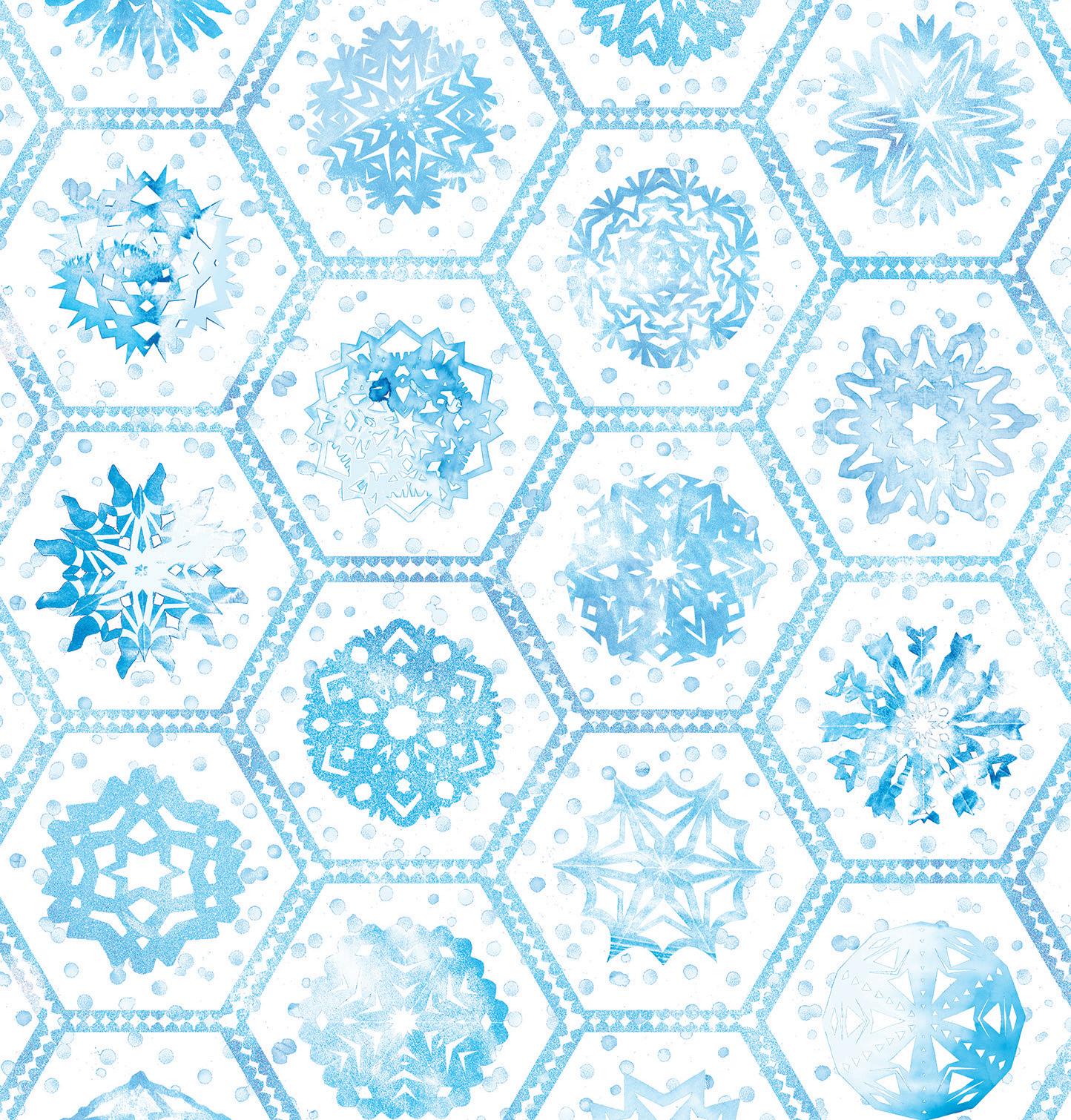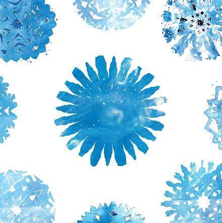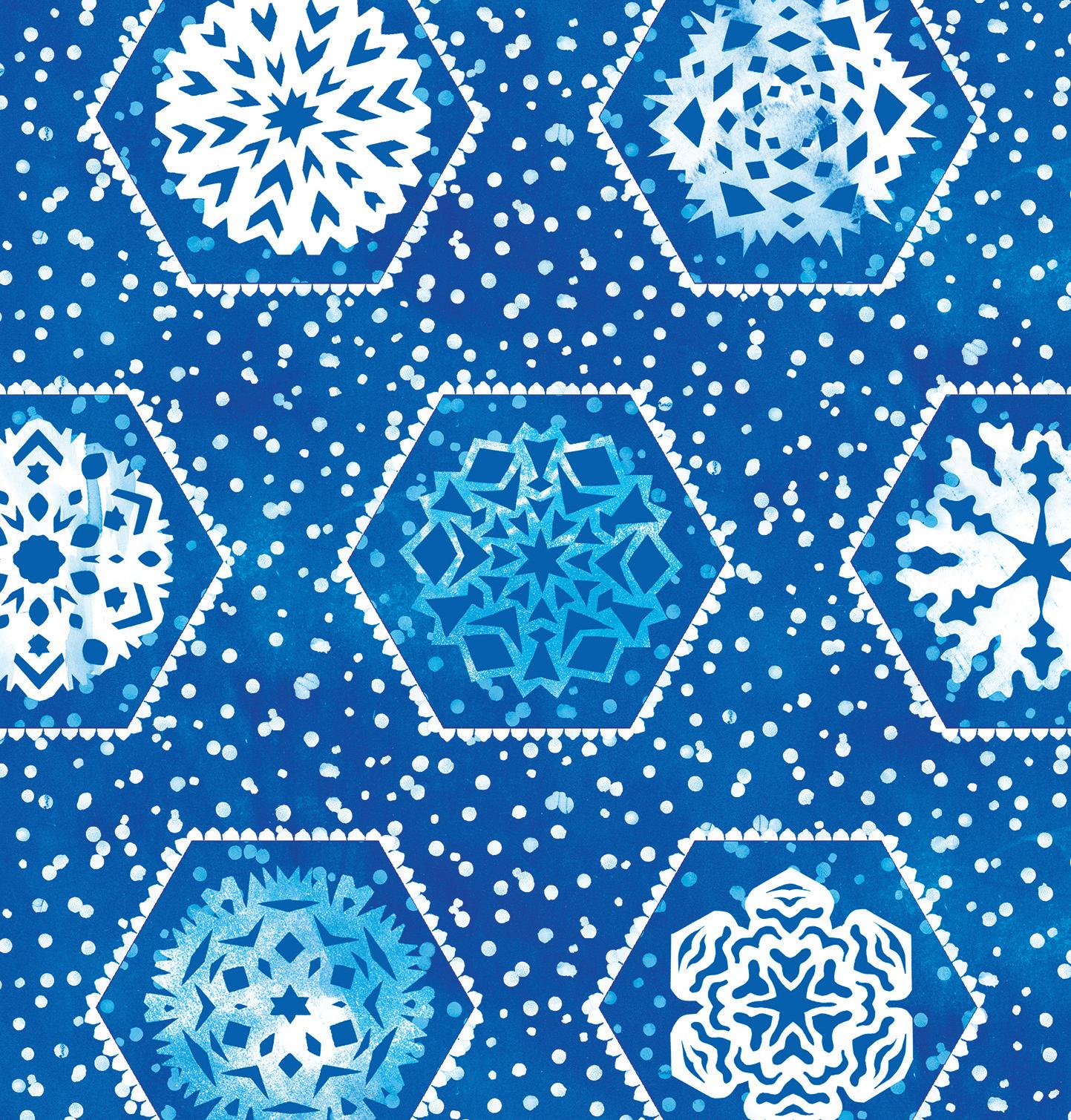 Paper Flurries celebrates the unique shapes of hand-cut snowflakes that were created by our team at Maywood Studio. Over 50 unique snowflakes were cut during a series of afternoon workshops. These paper cuts were then exposed with a traditional cyanotype process to create a variety of patterns. The resulting crystal forms, rich color saturation, and textured backgrounds were used to create the artwork for the beautiful textiles in the Paper Flurries collection.