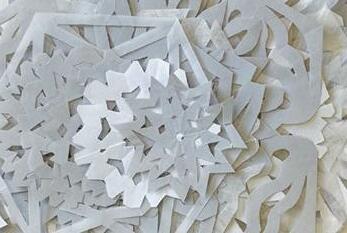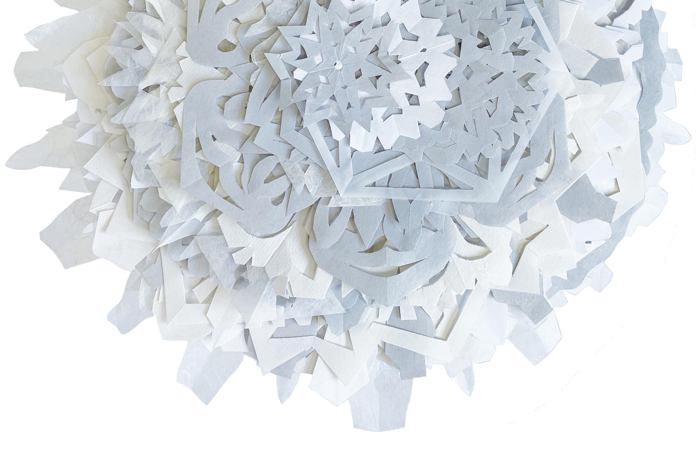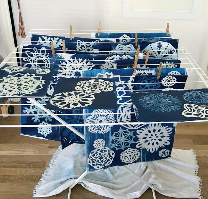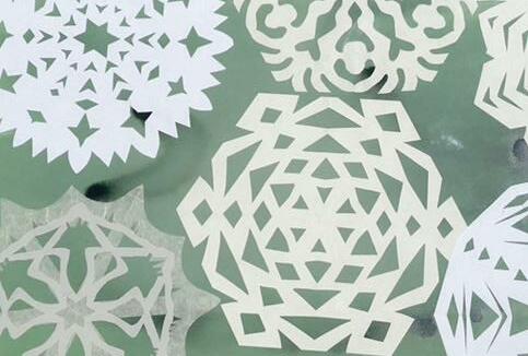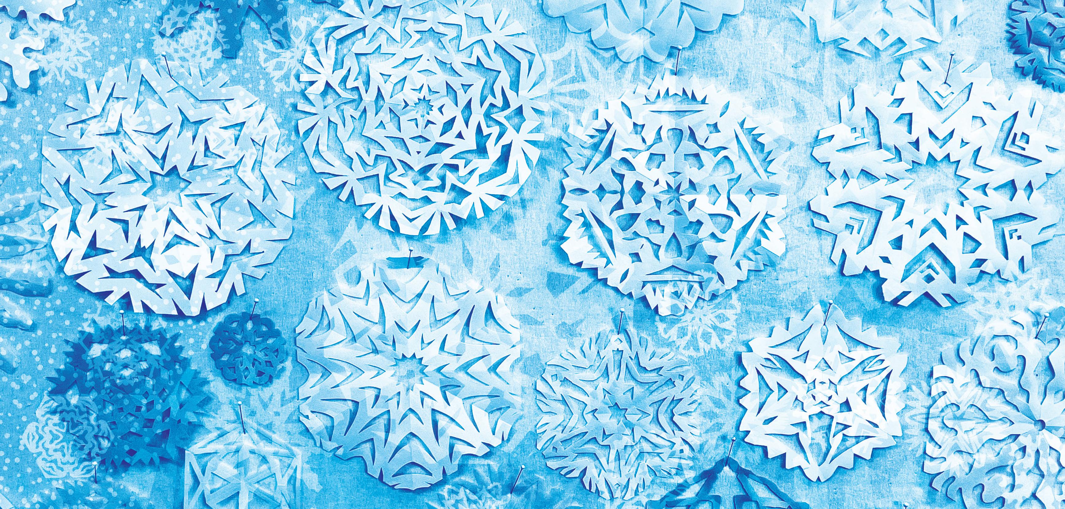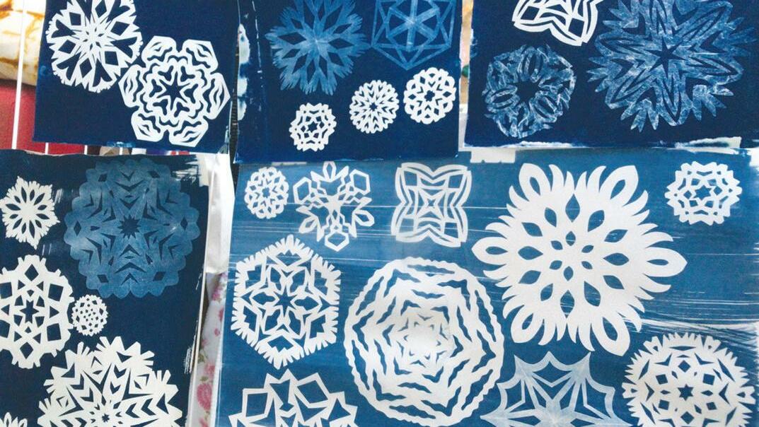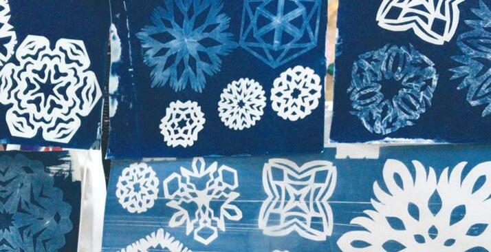 Paper Flurries celebrates the unique shapes of hand-cut snowflakes that were created by our team at Maywood Studio. Over 50 unique snowflakes were cut during a series of afternoon workshops. These paper cuts were then exposed with a traditional cyanotype process to create a variety of patterns. The resulting crystal forms, rich color saturation, and textured backgrounds were used to create the artwork for the beautiful textiles in the Paper Flurries collection.