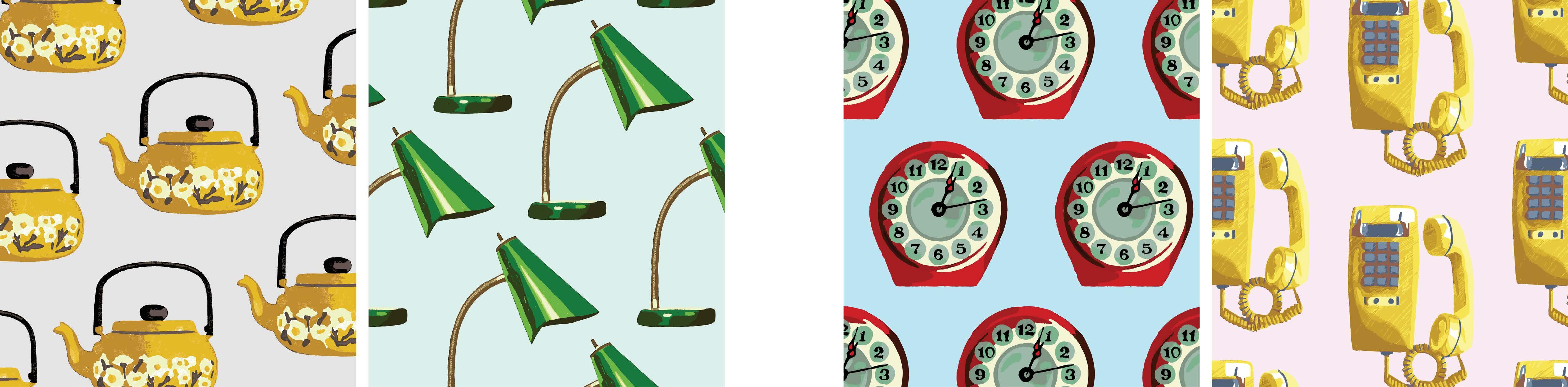 RECOLLECT Step back in time with this collection featuring an array of retro items rendered in a nostalgic pop art style.