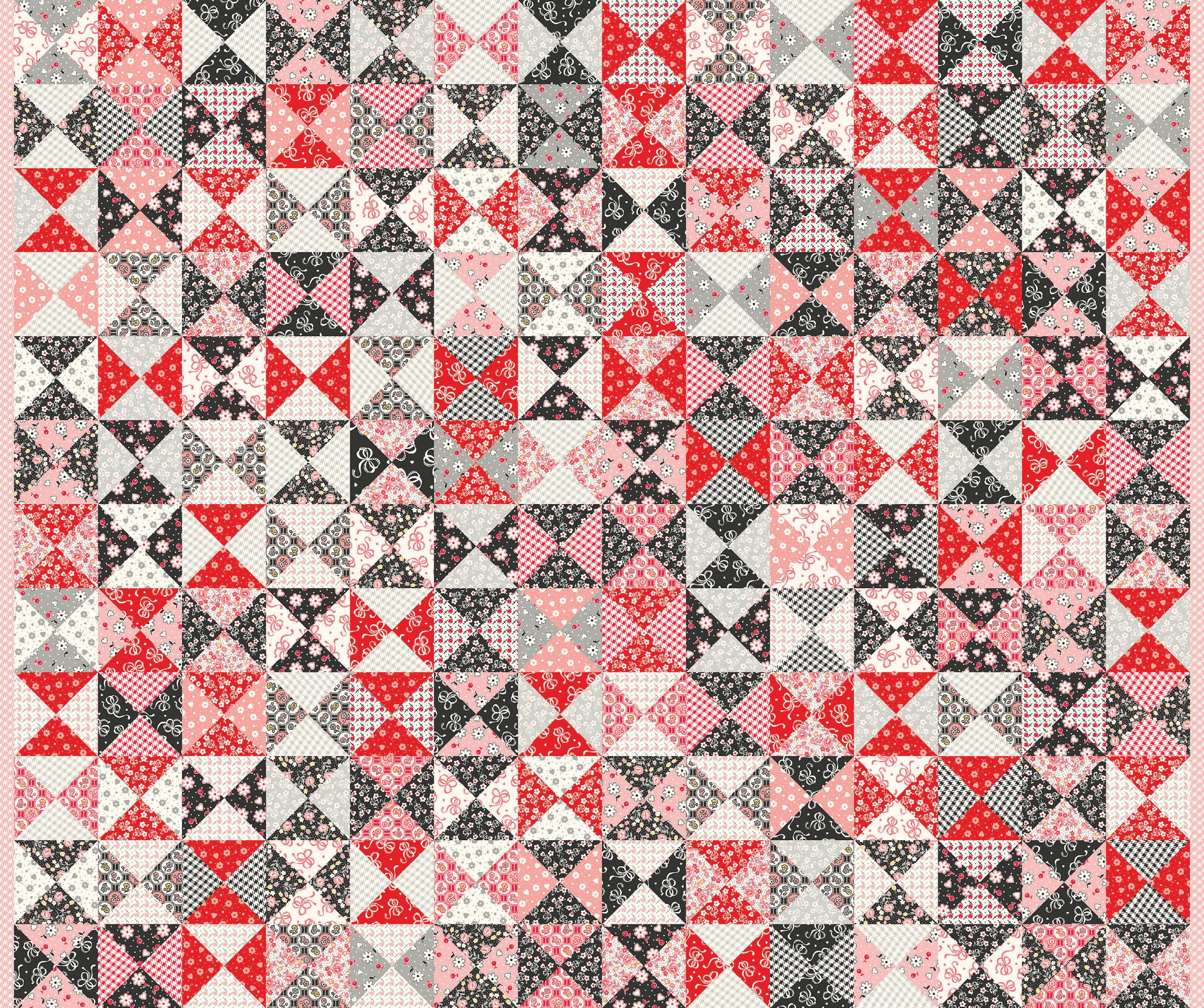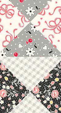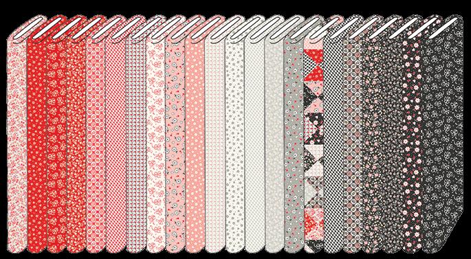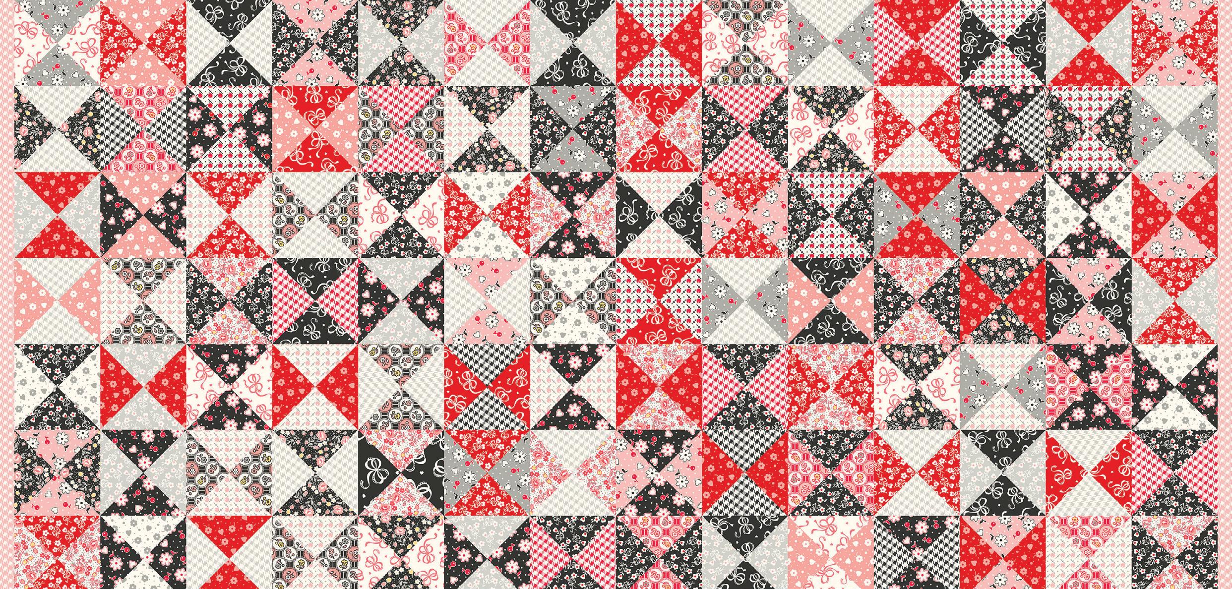 Dear Sweetheart celebrates Valentine charm with vintage feedsack prints from the 1930s. Bows, hearts, and ditsy florals in a sweet range of pinks, reds, and blacks evoke a heart-filled, nostalgic feel, while the centerpiece is a cheater quilt print based on the classic Broken Dishes block. As a Kim’s Cause collection, a portion of the proceeds is donated to cancer research.