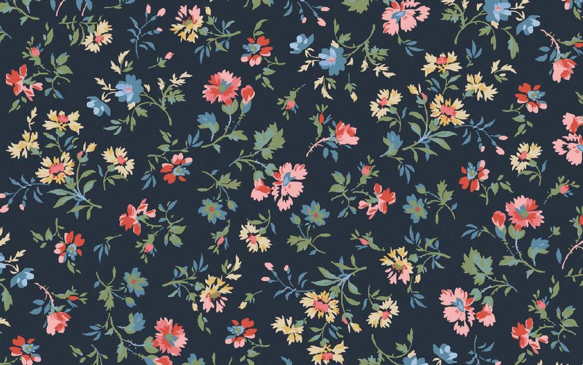 Nostalgia peppered in pretty calico prints call up images of clothing lines drying in the sunlight and simple handmade quilts. Deep navy blues and war m earthy browns provide the backdrop for charming birds and colorful posies. Sew all the prints together in sweet nine-patch blocks for prairie-inspired projects.
