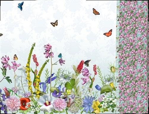 Block Frames & Butterfly Bodies: Multi Digital Packed Floral Y3967-55 White Digital Dutchman’s Breeches Y3969-1 ⅝ yard 1 bolt 1 bolt D. Butterfly Wings: White Digital Butterfly Floral Y3968-1 Light Teal Digital Meadow Y3965-103 ¾ yard 1 bolt 1 bolt E. Pieced Border: Light Teal Digital Butterfly Floral Y3968-103 White Digital Butterfly Floral Y3968-1 1 ¼ yards 1 bolt 2 bolts