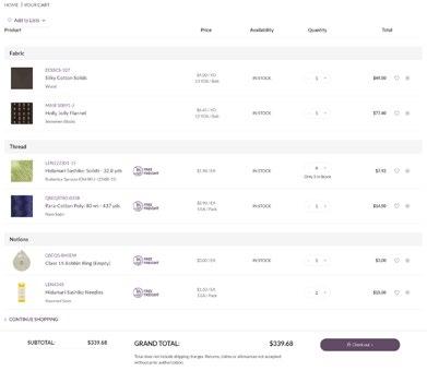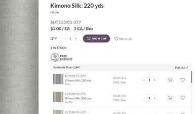 Products within the Thread category that share a common name or type are configured under a single card (ie. Kimono Silk Thread).