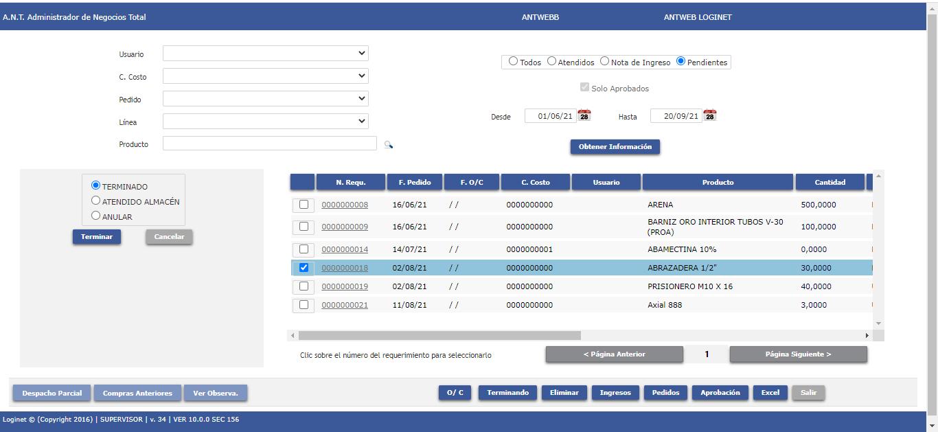 • Terminar, con este botón y previamente seleccionado el requerimiento se da por terminado el requerimiento., tiene tres opciones de selección terminar, atendido por almacén y anular.