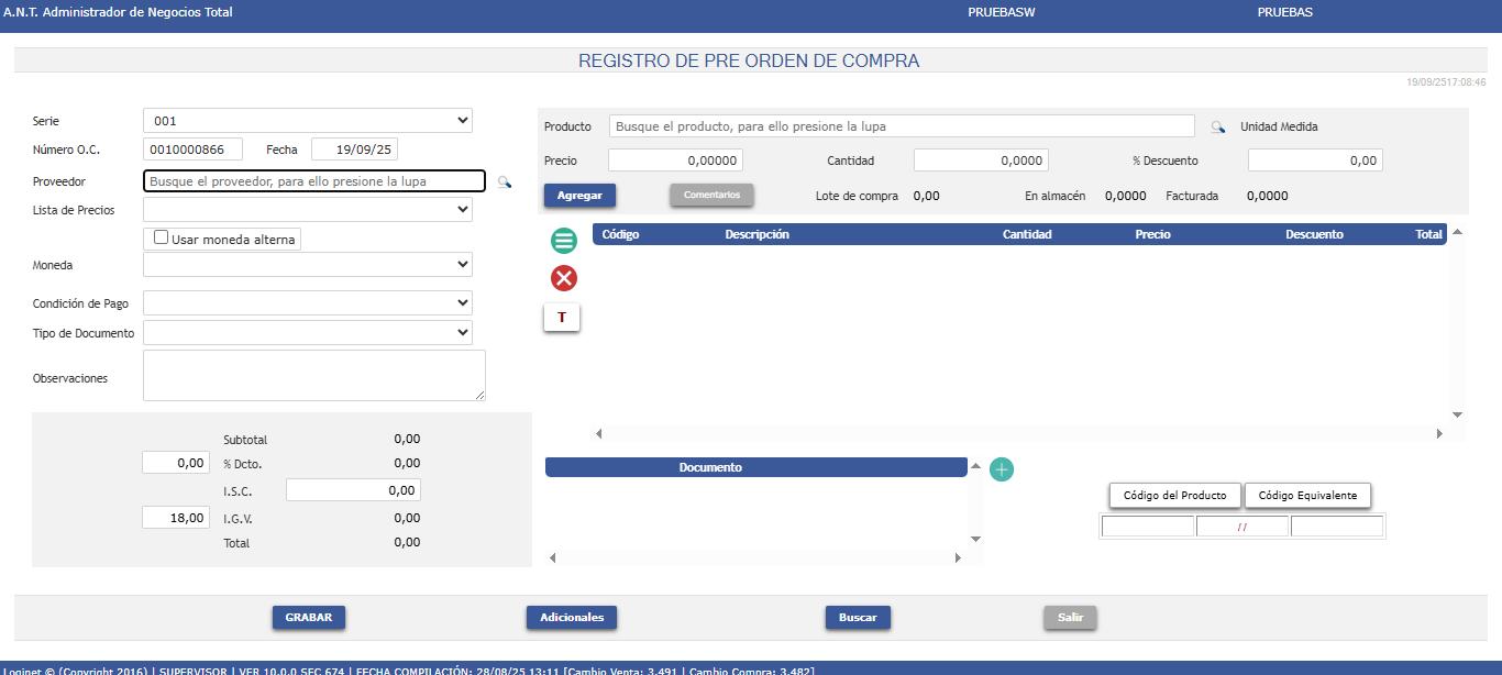 El sistema puede generar un correlativo de numeración en forma automática o por serie para cada usuario, según se haya parametrizado en la opción de Configuración, Opciones del Sistema, para las ordenes de compra y acezarán todos los productos que en el maestro cuenten con la característica de “Producto destinado para la compra” Los precios consignados en la orden de compra serán los que el sistema utilizara para valorizar los artículos que llegan al almacén en el momento que se emite la “ Nota de Ingreso ”.